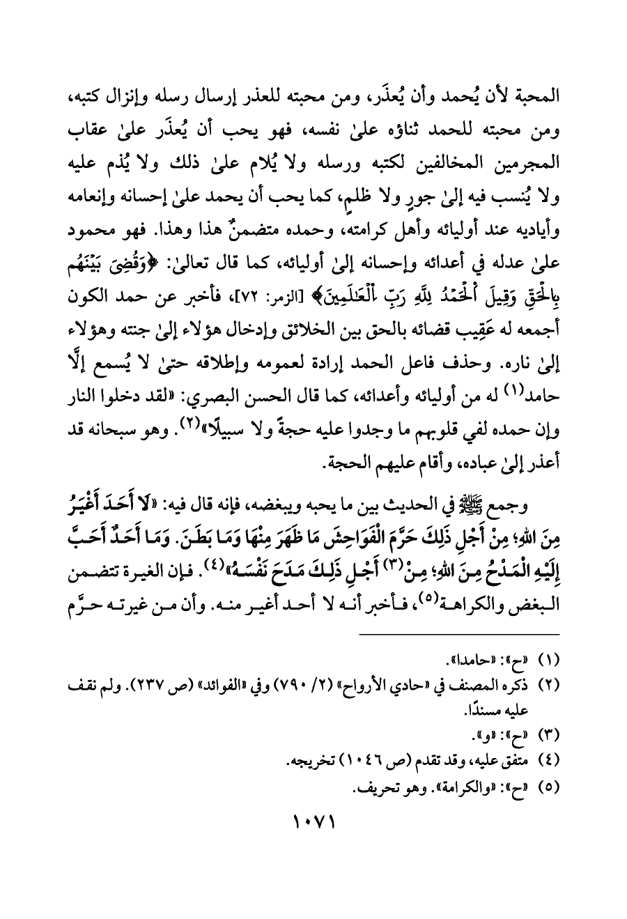 المحبة لأن يُحمد وأن يُعذَر، ومن محبته للعذر إرسال رسله وإنزال كتبه، ومن محبته للحمد ثناؤه على نفسه، فهو يحب أن يُعذَر على عقاب المجرمين المخالفين لكتبه ورسله ولا يُلام على ذلك ولا يُذم عليه ولا يُنسب فيه إلى جورٍ ولا ظلمٍ، كما يحب أن يحمد على إحسانه وإنعامه وأياديه عند أوليائه وأهل كرامته، وحمده متضمنٌ هذا وهذا. فهو محمود على عدله في أعدائه وإحسانه إلى أوليائه، كما قال تعالى: {وَقُضِيَ بَيْنَهُم بِالْحَقِّ وَقِيلَ اَلْحَمْدُ لِلَّهِ رَبِّ اِلْعَالَمِينَ} [الزمر: ٧٢]، فأخبر عن حمد الكون أجمعه له عَقِيب قضائه بالحق بين الخلائق وإدخال هؤلاء إلى جنته وهؤلاء إلى ناره. وحذف فاعل الحمد إرادة لعمومه وإطلاقه حتى لا يُسمع إلَّا حامد (¬١) له من أوليائه وأعدائه، كما قال الحسن البصري: «لقد دخلوا النار وإن حمده لفي قلوبهم ما وجدوا عليه حجةً ولا سبيلًا» (¬٢). وهو سبحانه قد أعذر إلى عباده، وأقام عليهم الحجة.