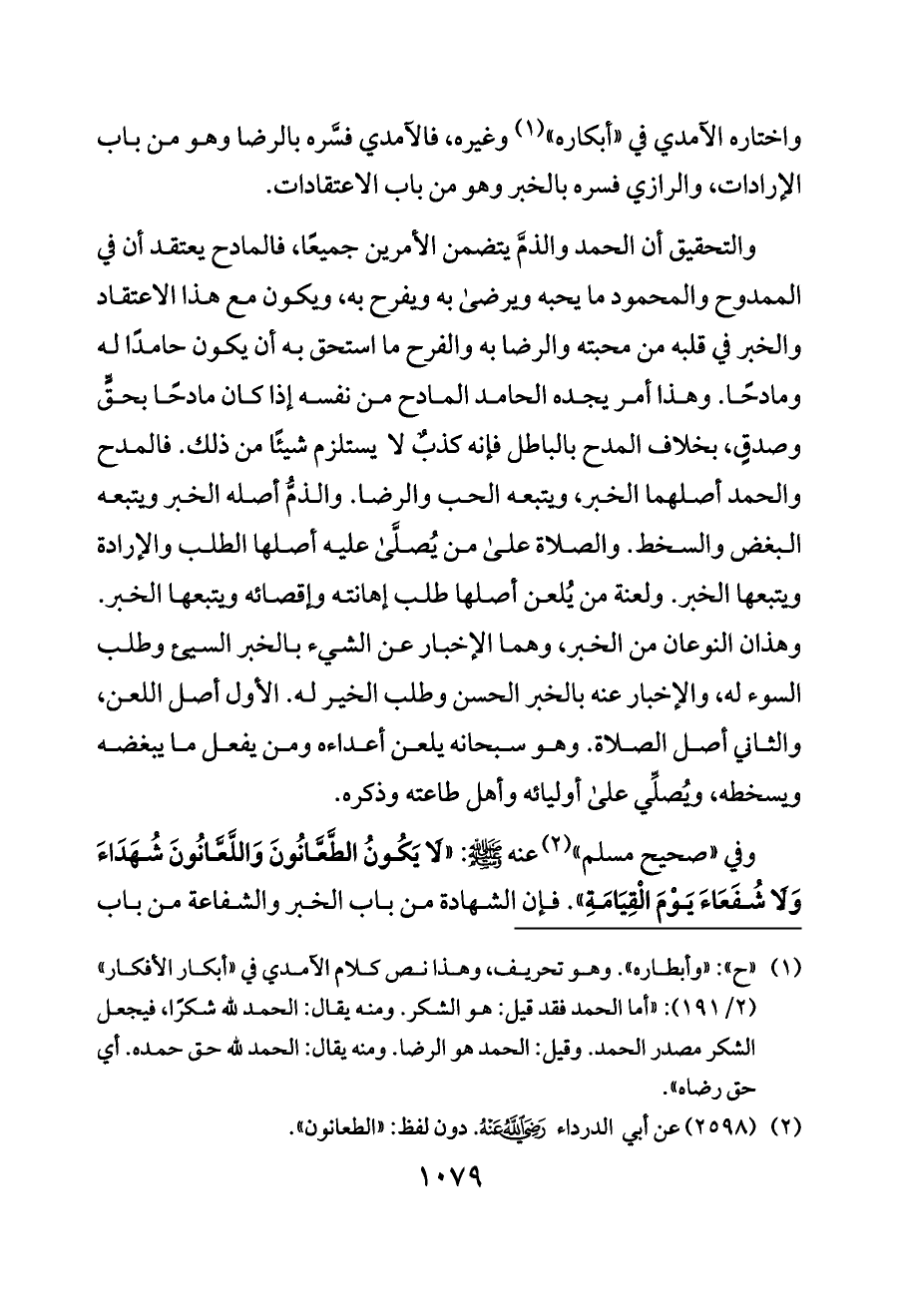 والتحقيق أن الحمد والذمَّ يتضمن الأمرين جميعًا، فالمادح يعتقد أن في الممدوح والمحمود ما يحبه ويرضى به ويفرح به، ويكون مع هذا الاعتقاد والخبر في قلبه من محبته والرضا به والفرح ما استحق به أن يكون حامدًا له ومادحًا. وهذا أمر يجده الحامد المادح من نفسه إذا كان مادحًا بحقٍّ وصدقٍ، بخلاف المدح بالباطل فإنه كذبٌ لا يستلزم شيئًا من ذلك. فالمدح والحمد أصلهما الخبر، ويتبعه الحب والرضا. والذمُّ أصله الخبر ويتبعه البغض والسخط. والصلاة على من يُصلَّى عليه أصلها الطلب والإرادة ويتبعها الخبر. ولعنة من يُلعن أصلها طلب إهانته وإقصائه ويتبعها الخبر. وهذان النوعان من الخبر، وهما الإخبار عن الشيء بالخبر السيئ وطلب السوء له، والإخبار عنه بالخبر الحسن وطلب الخير له. الأول أصل اللعن، والثاني أصل الصلاة. وهو سبحانه يلعن أعداءه ومن يفعل ما يبغضه ويسخطه، ويُصلِّي على أوليائه وأهل طاعته وذكره.