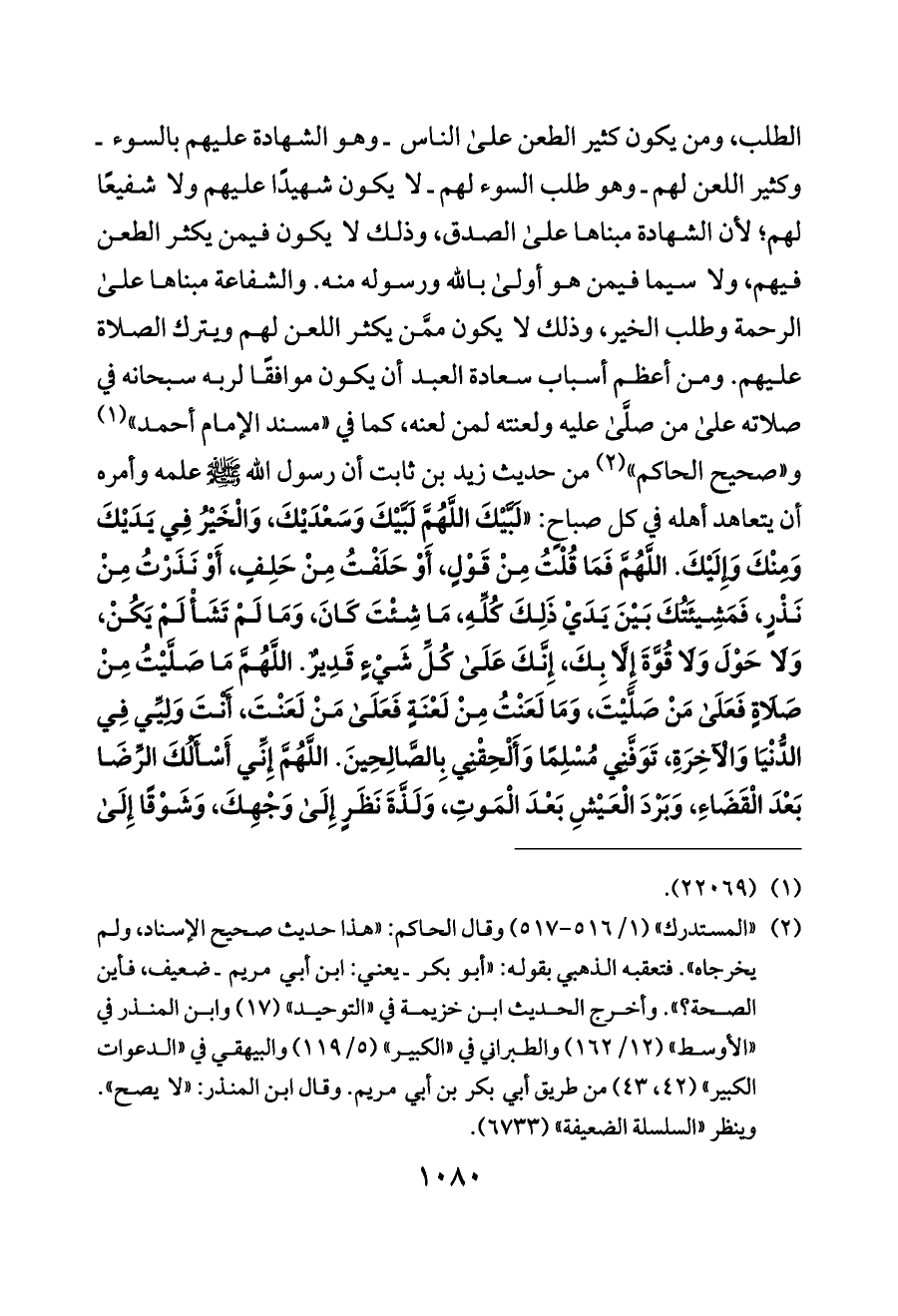 الطلب، ومن يكون كثير الطعن على الناس ـ وهو الشهادة عليهم بالسوء ـ وكثير اللعن لهم ـ وهو طلب السوء لهم ـ لا يكون شهيدًا عليهم ولا شفيعًا لهم؛ لأن الشهادة مبناها على الصدق، وذلك لا يكون فيمن يكثر الطعن فيهم، ولا سيما فيمن هو أولى بالله ورسوله منه. والشفاعة مبناها على الرحمة وطلب الخير، وذلك لا يكون ممَّن يكثر اللعن لهم ويترك الصلاة عليهم. ومن أعظم أسباب سعادة العبد أن يكون موافقًا لربه سبحانه في صلاته على من صلَّى عليه ولعنته لمن لعنه، كما في «مسند الإمام أحمد» (¬١) و «صحيح الحاكم» (¬٢) من حديث زيد بن ثابت أن رسول الله - صلى الله عليه وسلم - علمه وأمره أن يتعاهد أهله في كل صباحٍ: «لَبَّيْكَ اللَّهُمَّ لَبَّيْكَ وَسَعْدَيْكَ، وَالْخَيْرُ فِي يَدَيْكَ وَمِنْكَ وَإِلَيْكَ. اللَّهُمَّ فَمَا قُلْتُ مِنْ قَوْلٍ، أَوْ حَلَفْتُ مِنْ حَلِفٍ، أَوْ نَذَرْتُ مِنْ نَذْرٍ، فَمَشِيئَتُكَ بَيْنَ يَدَيْ ذَلِكَ كُلِّهِ، مَا شِئْتَ كَانَ، وَمَا لَمْ تَشَأْ لَمْ يَكُنْ، وَلَا حَوْلَ وَلَا قُوَّةَ إِلَّا بِكَ، إِنَّكَ عَلَى كُلِّ شَيْءٍ قَدِيرٌ.