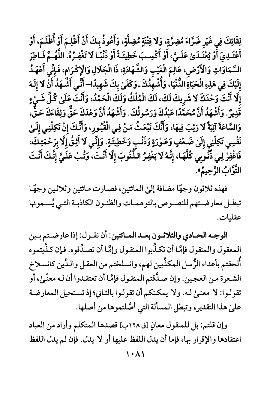 الوجه الحادي والثلاثون بعد المائتين: أن نقول: إذا عارضتم بين المعقول والمنقول فإمَّا أن تكذِّبوا المنقول وإمَّا أن تصدِّقوه. فإن كذَّبتموه أُلحقتم بأعداء الرُّسل المكذِّبين لهم، وانسلختم من العقل والدِّين كانسلاخ الشعرة من العجين. وإن صدَّقتم المنقول فإمَّا أن تعتقدوا أن له معنًى، أو تقولوا: لا معنى له. ولا يمكنكم أن تقولوا بالثاني؛ إذ تستحيل المعارضة على هذا التقدير، وتبطل المسألة التي أصَّلتموها من أصلها.