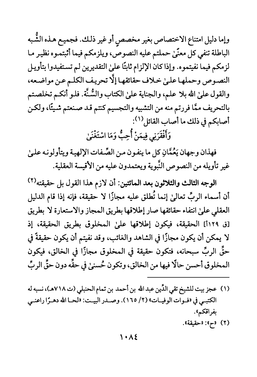 الوجه الثالث والثلاثون بعد المائتين: أن لازم هذا القول بل حقيقته (¬٢) أن أسماء الربِّ تعالى إنما تُطلق عليه مجازًا لا حقيقة، فإنه إذا قام الدليل العقلي على انتفاء حقائقها صار إطلاقها بطريق المجاز والاستعارة لا بطريق [ق ١٢٩ أ] الحقيقة، فيكون إطلاقها على المخلوق بطريق الحقيقة، إذ لا يمكن أن يكون مجازًا في الشاهد والغائب، وقد نفيتم أن يكون حقيقةً في حقِّ الربِّ سبحانه، فتكون حقيقة في المخلوق مجازًا في الخالق، فيكون المخلوق أحسن حالًا فيها من الخالق، وتكون حُسنى في حقِّه دون حقِّ الربِّ