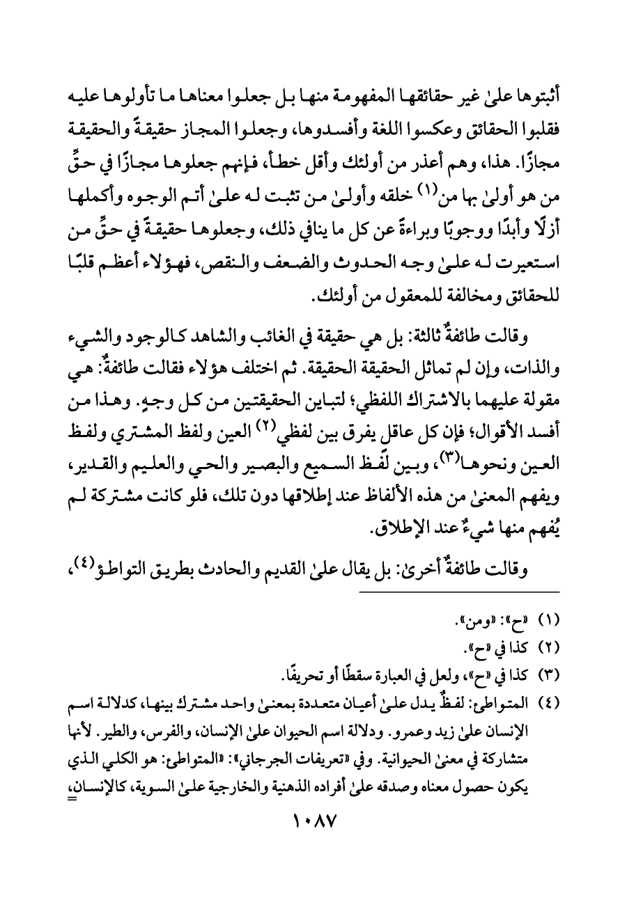 وقالت طائفةٌ أخرى: بل يقال على القديم والحادث بطريق التواطؤ (¬٤)،