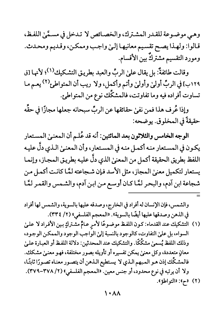 وقالت طائفةٌ: بل يقال على الربِّ والعبد بطريق التشكيك (¬١)؛ لأنها [ق ١٢٩ ب] في الربِّ أولى وأولى وأتم وأكمل، ولا ريب أن المتواطئ (¬٢) يعم ما تساوت أفراده فيه وما تفاوتت، فالمشكِّك نوع من المتواطئ.