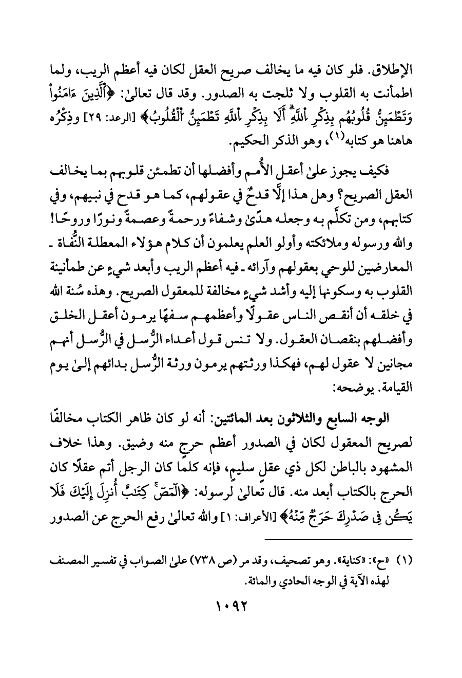 الوجه السابع والثلاثون بعد المائتين: أنه لو كان ظاهر الكتاب مخالفًا لصريح المعقول لكان في الصدور أعظم حرجٍ منه وضيق. وهذا خلاف المشهود بالباطن لكل ذي عقلٍ سليمٍ، فإنه كلما كان الرجل أتم عقلًا كان الحرج بالكتاب أبعد منه. قال تعالى لرسوله: {المص كِتَابٌ أُنزِلَ إِلَيْكَ فَلَا يَكُن فِي صَدْرِكَ حَرَجٌ مِّنْهُ} [الأعراف: ١] والله تعالى رفع الحرج عن الصدور