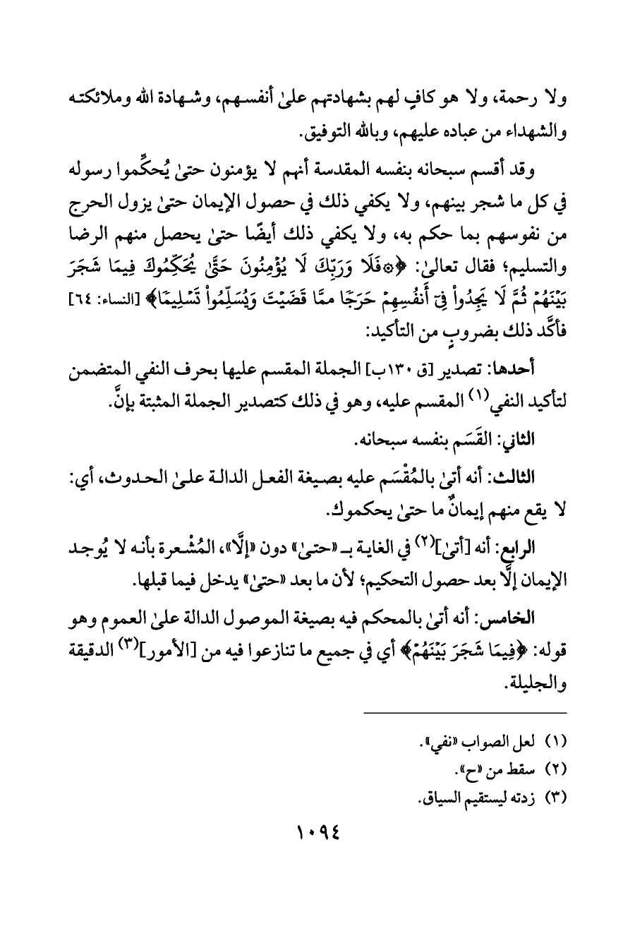 وقد أقسم سبحانه بنفسه المقدسة أنهم لا يؤمنون حتى يُحكِّموا رسوله في كل ما شجر بينهم، ولا يكفي ذلك في حصول الإيمان حتى يزول الحرج من نفوسهم بما حكم به، ولا يكفي ذلك أيضًا حتى يحصل منهم الرضا والتسليم؛ فقال تعالى: {* فَلَا وَرَبِّكَ لَا يُؤْمِنُونَ حَتَّى يُحَكِّمُوكَ فِيمَا شَجَرَ بَيْنَهُمْ ثُمَّ لَا يَجِدُوا فِي أَنفُسِهِمْ حَرَجًا ممَّا قَضَيْتَ وَيُسَلِّمُوا تَسْلِيمًا} [النساء: ٦٤] فأكَّد ذلك بضروبٍ من التأكيد: