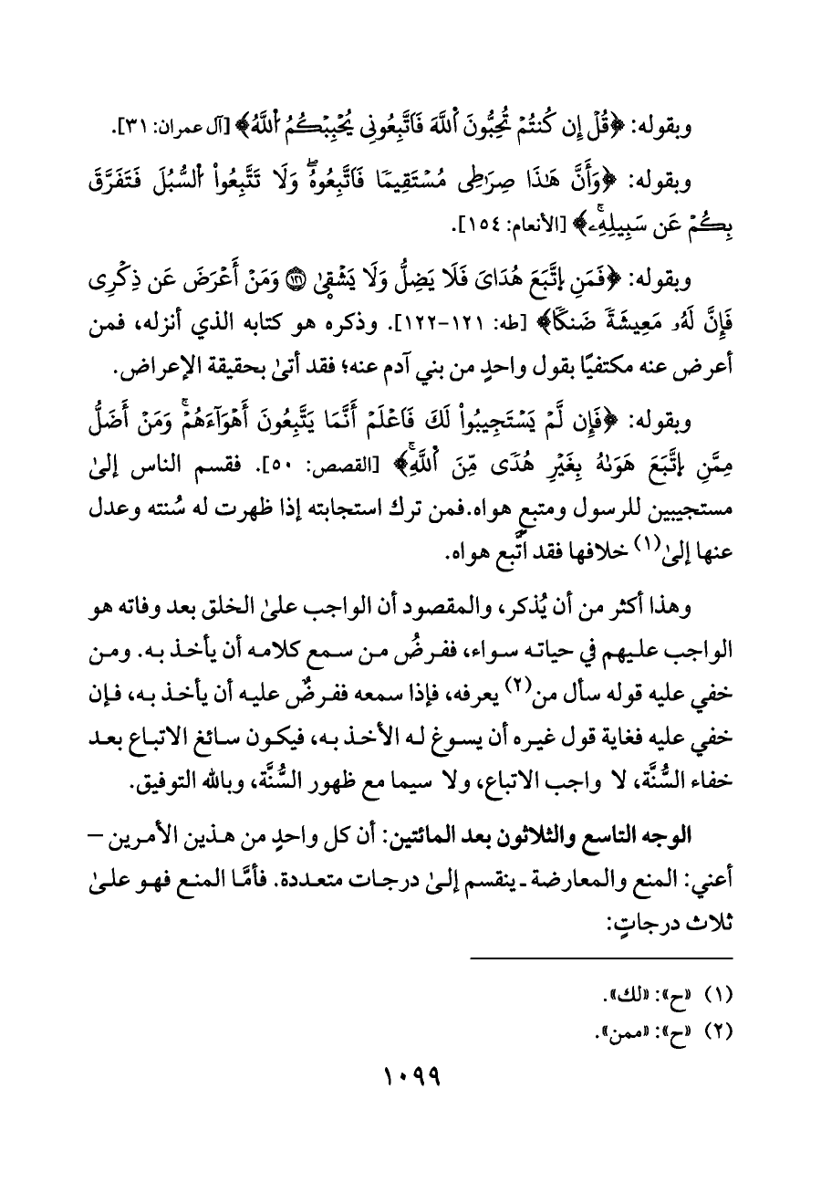 وبقوله: {فَإِن لَّمْ يَسْتَجِيبُوا لَكَ فَاَعْلَمْ أَنَّمَا يَتَّبِعُونَ أَهْوَاءَهُمْ وَمَنْ أَضَلُّ مِمَّنِ اِتَّبَعَ هَوَاهُ بِغَيْرِ هُدًى مِّنَ اَللَّهِ} [القصص: ٥٠]. فقسم الناس إلى مستجيبين للرسول ومتبعٍ هواه. فمن ترك استجابته إذا ظهرت له سُنته وعدل عنها إلى (¬١) خلافها فقد اتَّبع هواه.