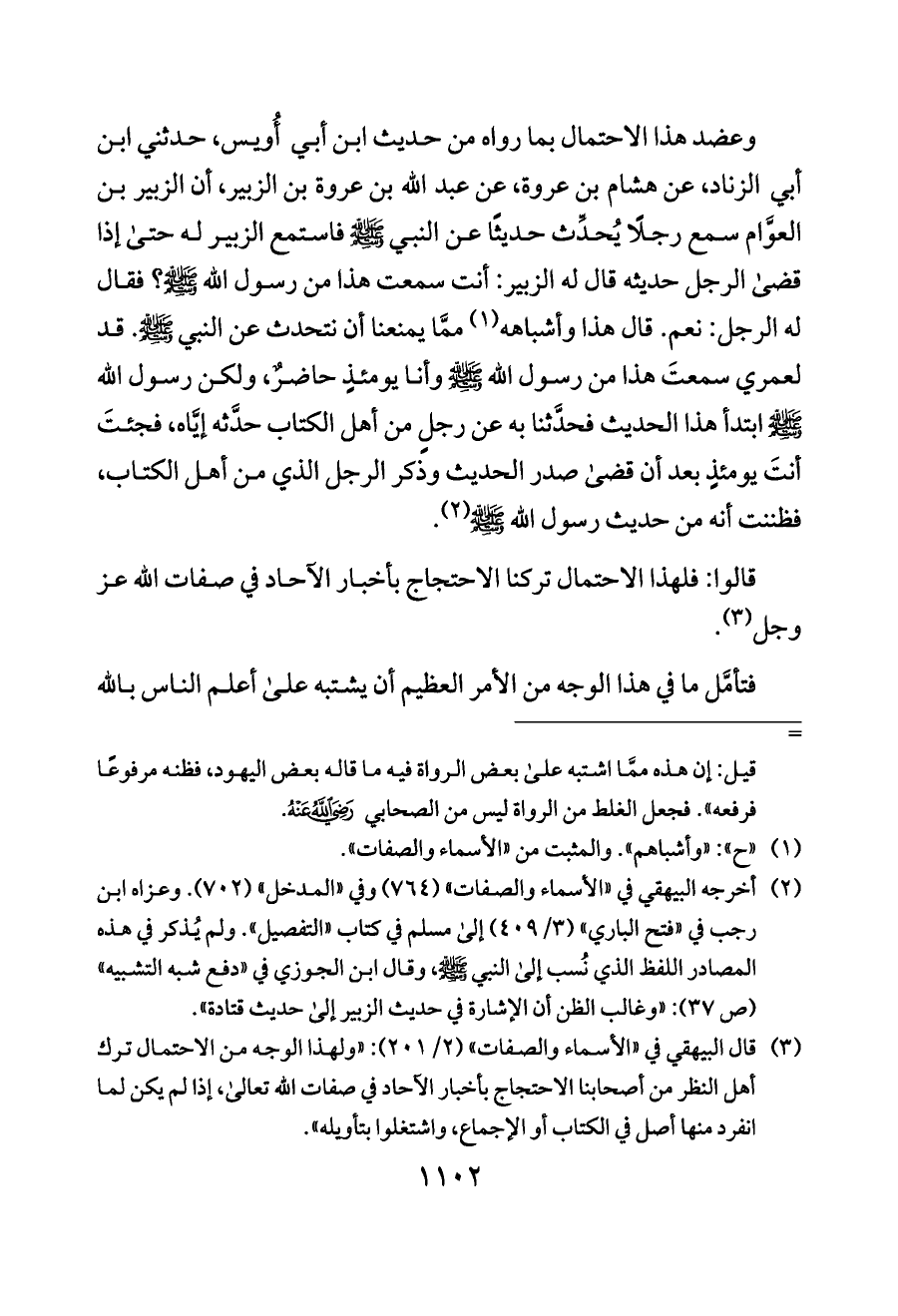 (¬٣) قال البيهقي في «الأسماء والصفات» (٢/ ٢٠١): «ولهذا الوجه من الاحتمال ترك أهل النظر من أصحابنا الاحتجاج بأخبار الآحاد في صفات الله تعالى، إذا لم يكن لما انفرد منها أصل في الكتاب أو الإجماع، واشتغلوا بتأويله».