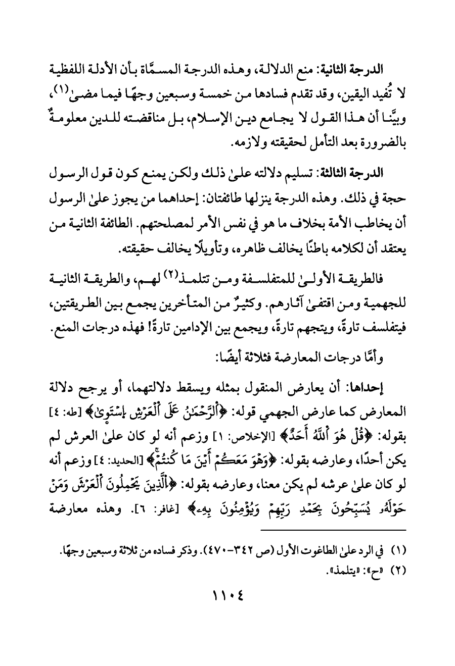 الدرجة الثالثة: تسليم دلالته على ذلك ولكن يمنع كون قول الرسول حجة في ذلك. وهذه الدرجة ينزلها طائفتان: إحداهما من يجوز على الرسول أن يخاطب الأمة بخلاف ما هو في نفس الأمر لمصلحتهم. الطائفة الثانية من يعتقد أن لكلامه باطنًا يخالف ظاهره، وتأويلًا يخالف حقيقته.