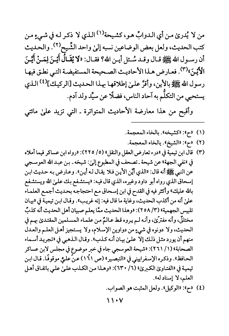 (¬٣) قال ابن تيمية في «درء تعارض العقل والنقل» (٥/ ٢٢٥): «رواه ابن عساكر فيما أملاه في «نفي الجهة» عن شيحة ـ تصحف في المطبوع إلى: شيخه ـ بن عبد الله العوسجي عن النبي - صلى الله عليه وسلم - أنه قال: «الذي أيَّن الأين فلا يقال له أين». وعارض به حديث ابن إسحاق الذي رواه أبو داود وغيره، الذي قال فيه: «يستشفع بك على الله ويستشفع بالله عليك» وأكثر فيه في القدح في ابن إسحاق مع احتجاجه بحديث أجمع العلماء على أنه من أكذب الحديث، وغاية ما قال فيه: إنه غريب». وقال ابن تيمية في «بيان تلبيس الجهمية» (٣/ ٢٥٨): «وهذا الحديث ممَّا يعلم صبيان أهل الحديث أنه كذبٌ مختلقٌ، وأنه مفترًى، وأنه لم يروه قط عالمٌ من علماء المسلمين المقتدى بهم في الحديث، ولا دونوه في شيءٍ من دواوين الإسلام، ولا يستجيز أهل العلم والعدل منهم أن يورد مثل ذلك إلا على بيان أنه كذب». وقال الذهبي في «تجريد أسماء الصحابة» (١/ ٢٦١): «شيحة العوسجي جاء في خبرٍ موضوعٍ في مجلس لابن عساكر الحافظ». وذكره الإسفراييني في «التبصير» (ص ١٦١) عن عليٍّ موقوفًا. قال ابن تيمية في «الفتاوى الكبرى» (٦/ ٦٣٠): «وهذا من الكذب على علي باتفاق أهل العلم، لا إسناد له».