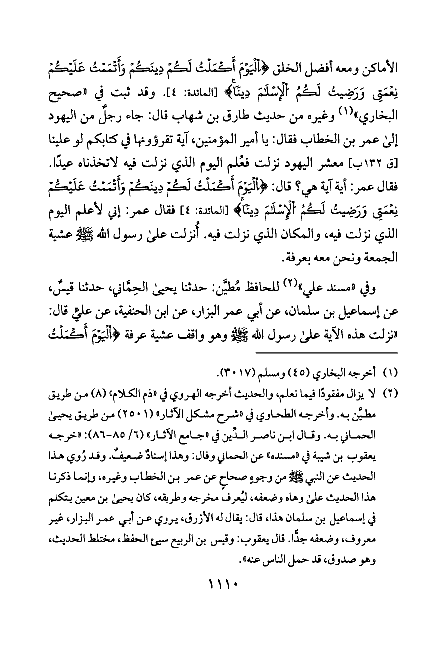 وفي «مسند علي» (¬٢) للحافظ مُطيَّن: حدثنا يحيى الحِمَّاني، حدثنا قيسٌ، عن إسماعيل بن سلمان، عن أبي عمر البزار، عن ابن الحنفية، عن عليٍّ قال: «نزلت هذه الآية على رسول الله - صلى الله عليه وسلم - وهو واقف عشية عرفة {اِلْيَوْمَ أَكْمَلْتُ
