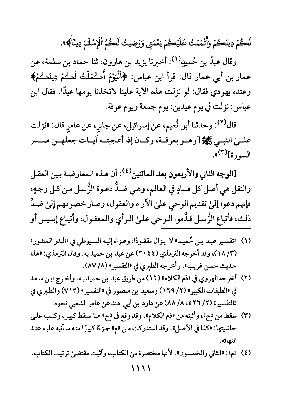 وقال عبدُ بن حُميدٍ (¬١): أخبرنا يزيد بن هارون، ثنا حماد بن سلمة، عن عمار بن أبي عمار قال: قرأ ابن عباس: {اِلْيَوْمَ أَكْمَلْتُ لَكُمْ دِينَكُمْ} وعنده يهودي فقال: لو نزلت هذه الآية علينا لاتخذنا يومها عيدًا. فقال ابن عباس: نزلت في يوم عيدين: يوم جمعة ويوم عرفة.