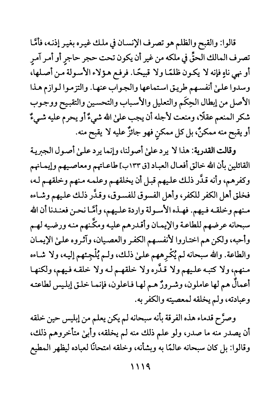قالوا: والقبح والظلم هو تصرف الإنسان في ملك غيره بغير إذنه، فأمَّا تصرف المالك الحقِّ في ملكه من غير أن يكون تحت حجر حاجرٍ أو أمر آمرٍ أو نهي ناهٍ فإنه لا يكون ظلمًا ولا قبيحًا. فرفع هؤلاء الأسولة من أصلها، وسدوا على أنفسهم طريق استماعها والجواب عنها. والتزموا لوازم هذا الأصل من إبطال الحِكَم والتعليل والأسباب والتحسين والتقبيح ووجوب شكر المنعم عقلًا، ومنعت لأجله أن يجب على الله شيءٌ أو يحرم عليه شيءٌ أو يقبح منه ممكنٌ، بل كل ممكنٍ فهو جائزٌ عليه لا يقبح منه.