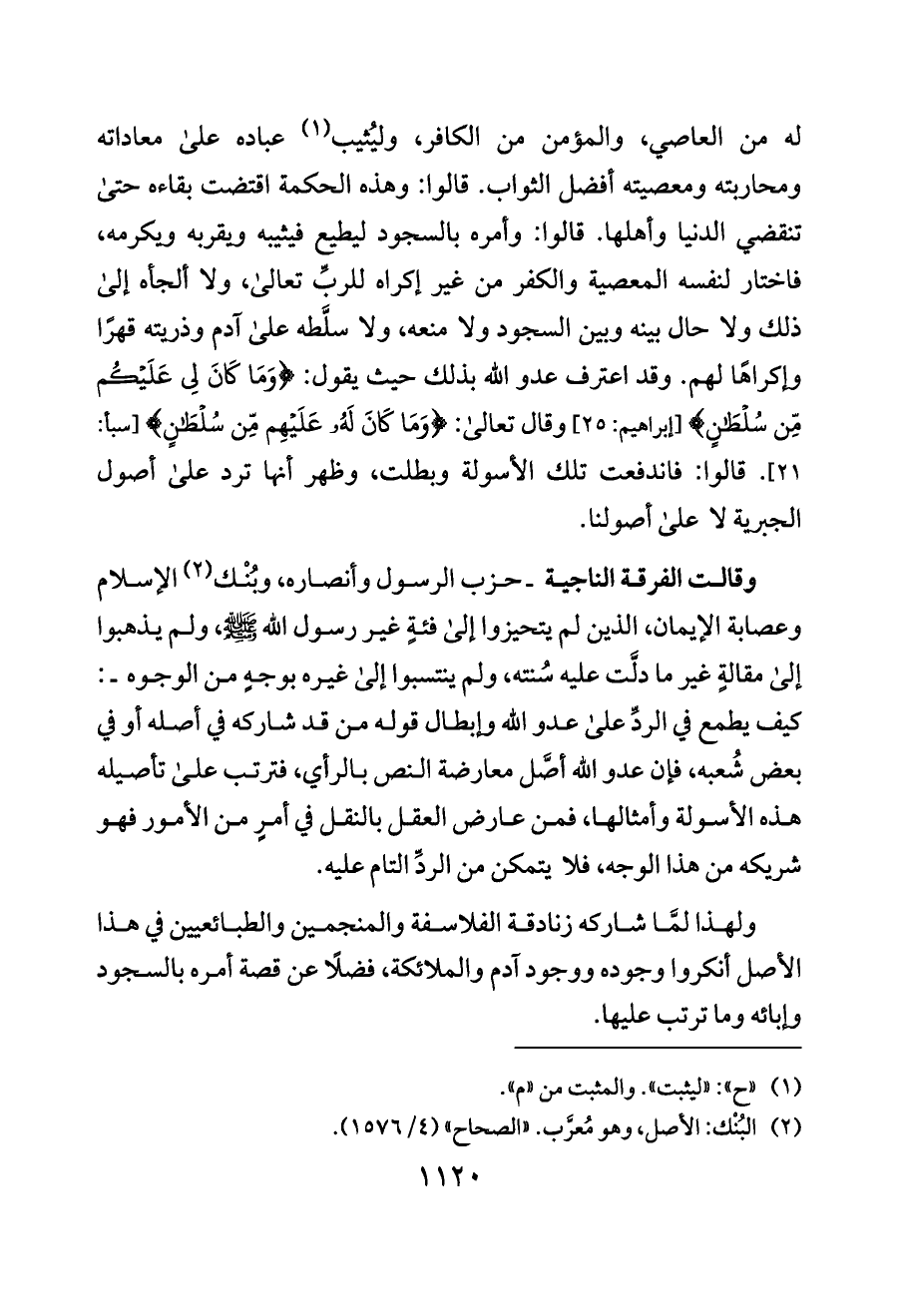 له من العاصي، والمؤمن من الكافر، وليُثيب (¬١) عباده على معاداته ومحاربته ومعصيته أفضل الثواب. قالوا: وهذه الحكمة اقتضت بقاءه حتى تنقضي الدنيا وأهلها. قالوا: وأمره بالسجود ليطيع فيثيبه ويقربه ويكرمه، فاختار لنفسه المعصية والكفر من غير إكراه للربِّ تعالى، ولا ألجأه إلى ذلك ولا حال بينه وبين السجود ولا منعه، ولا سلَّطه على آدم وذريته قهرًا وإكراهًا لهم. وقد اعترف عدو الله بذلك حيث يقول: {وَمَا كَانَ لِي عَلَيْكُم مِّن سُلْطَانٍ} [إبراهيم: ٢٥] وقال تعالى: {وَمَا كَانَ لَهُ عَلَيْهِم مِّن سُلْطَانٍ} [سبأ: ٢١]. قالوا: فاندفعت تلك الأسولة وبطلت، وظهر أنها ترد على أصول الجبرية لا على أصولنا.