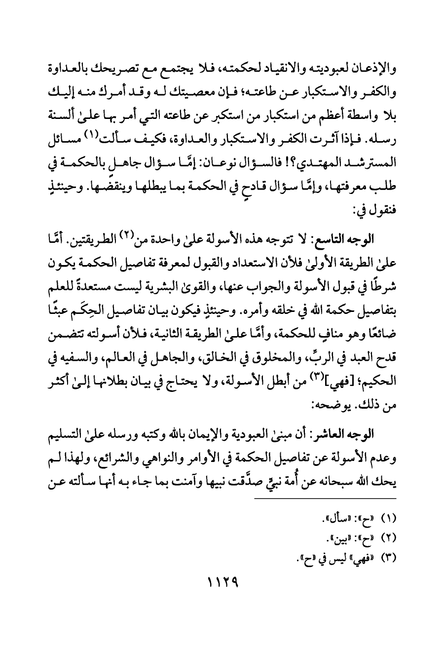 الوجه التاسع: لا تتوجه هذه الأسولة على واحدة من (¬٢) الطريقتين. أمَّا على الطريقة الأولى فلأن الاستعداد والقبول لمعرفة تفاصيل الحكمة يكون شرطًا في قبول الأسولة والجواب عنها، والقوى البشرية ليست مستعدةً للعلم بتفاصيل حكمة الله في خلقه وأمره. وحينئذٍ فيكون بيان تفاصيل الحِكَم عبثًا ضائعًا وهو منافٍ للحكمة، وأمَّا على الطريقة الثانية، فلأن أسولته تتضمن قدح العبد في الربِّ، والمخلوق في الخالق، والجاهل في العالم، والسفيه في الحكيم؛ [فهي] (¬٣) من أبطل الأسولة، ولا يحتاج في بيان بطلانها إلى أكثر من ذلك. يوضحه: