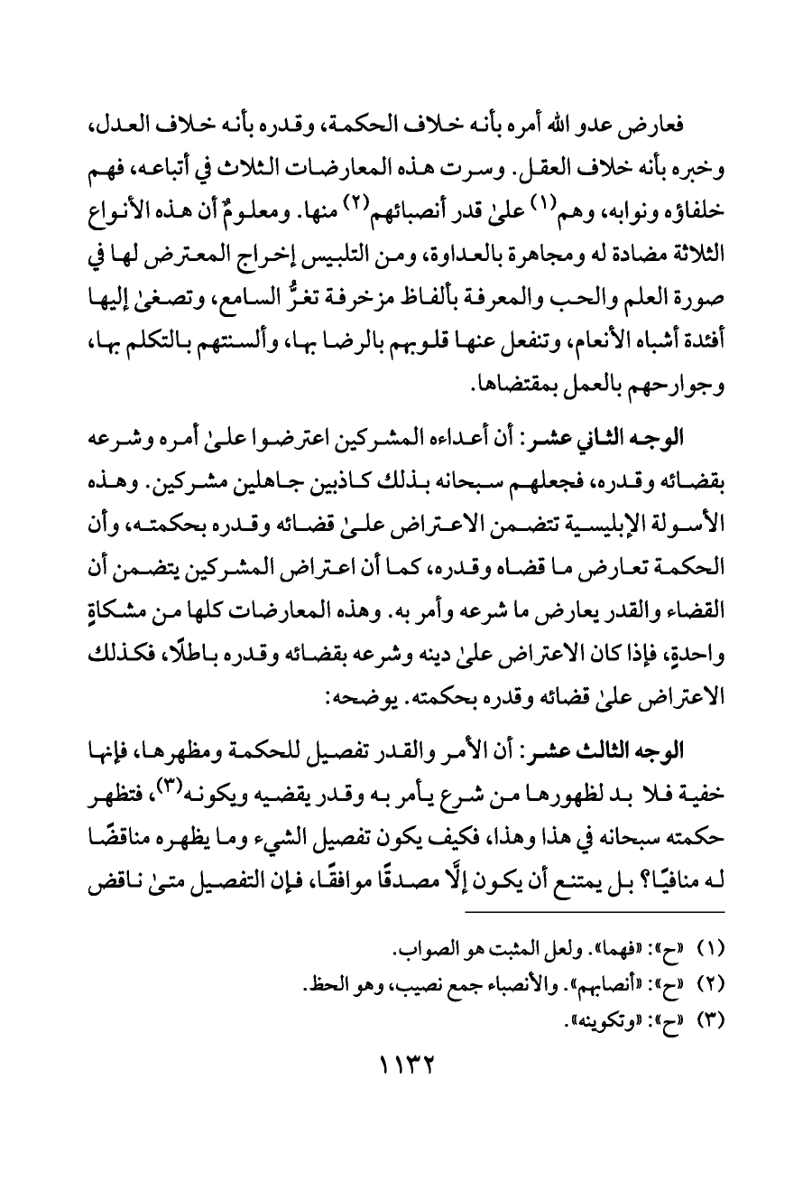 الوجه الثاني عشر: أن أعداءه المشركين اعترضوا على أمره وشرعه بقضائه وقدره، فجعلهم سبحانه بذلك كاذبين جاهلين مشركين. وهذه الأسولة الإبليسية تتضمن الاعتراض على قضائه وقدره بحكمته، وأن الحكمة تعارض ما قضاه وقدره، كما أن اعتراض المشركين يتضمن أن القضاء والقدر يعارض ما شرعه وأمر به. وهذه المعارضات كلها من مشكاةٍ واحدةٍ، فإذا كان الاعتراض على دينه وشرعه بقضائه وقدره باطلًا، فكذلك الاعتراض على قضائه وقدره بحكمته. يوضحه: