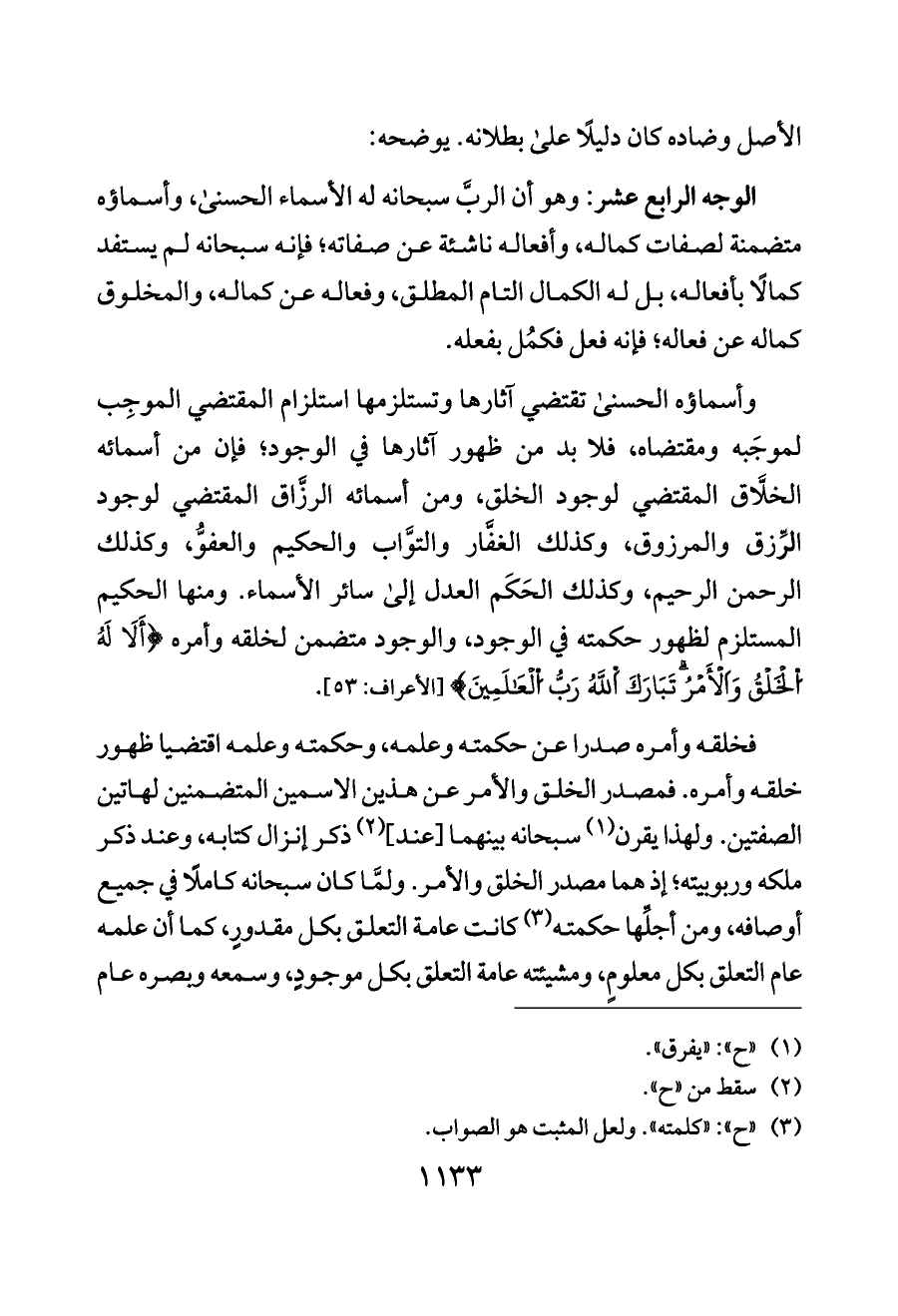 وأسماؤه الحسنى تقتضي آثارها وتستلزمها استلزام المقتضي الموجِب لموجَبه ومقتضاه، فلا بد من ظهور آثارها في الوجود؛ فإن من أسمائه الخلَّاق المقتضي لوجود الخلق، ومن أسمائه الرزَّاق المقتضي لوجود الرِّزق والمرزوق، وكذلك الغفَّار والتوَّاب والحكيم والعفوُّ، وكذلك الرحمن الرحيم، وكذلك الحَكَم العدل إلى سائر الأسماء. ومنها الحكيم المستلزم لظهور حكمته في الوجود، والوجود متضمن لخلقه وأمره {أَلَا لَهُ اُلْخَلْقُ وَاَلْأَمْرُ تَبَارَكَ اَللَّهُ رَبُّ اُلْعَالَمِينَ} [الأعراف: ٥٣].