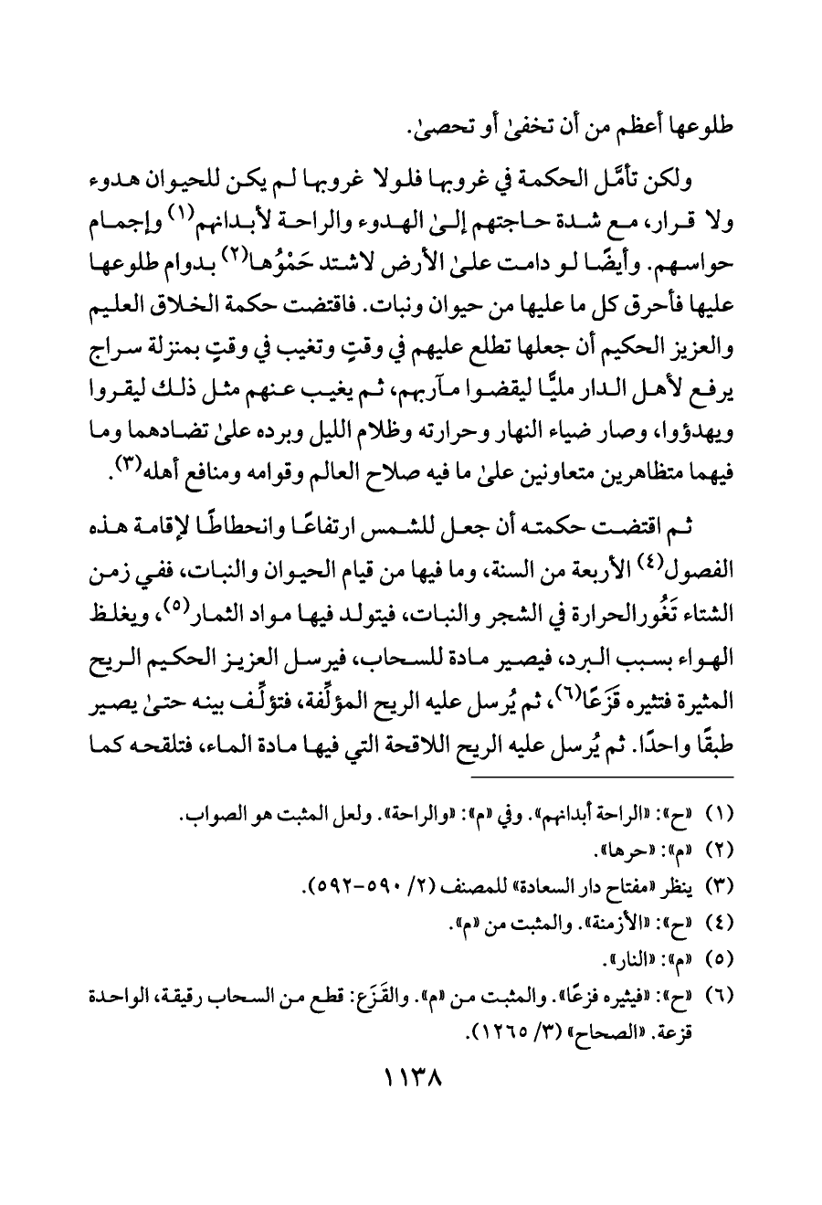 ولكن تأمَّل الحكمة في غروبها فلولا غروبها لم يكن للحيوان هدوء ولا قرار، مع شدة حاجتهم إلى الهدوء والراحة لأبدانهم (¬١) وإجمام حواسهم. وأيضًا لو دامت على الأرض لاشتد حَمْوُها (¬٢) بدوام طلوعها عليها فأحرق كل ما عليها من حيوان ونبات. فاقتضت حكمة الخلاق العليم والعزيز الحكيم أن جعلها تطلع عليهم في وقتٍ وتغيب في وقتٍ بمنزلة سراج يرفع لأهل الدار مليًّا ليقضوا مآربهم، ثم يغيب عنهم مثل ذلك ليقروا ويهدؤوا، وصار ضياء النهار وحرارته وظلام الليل وبرده على تضادهما وما فيهما متظاهرين متعاونين على ما فيه صلاح العالم وقوامه ومنافع أهله (¬٣).