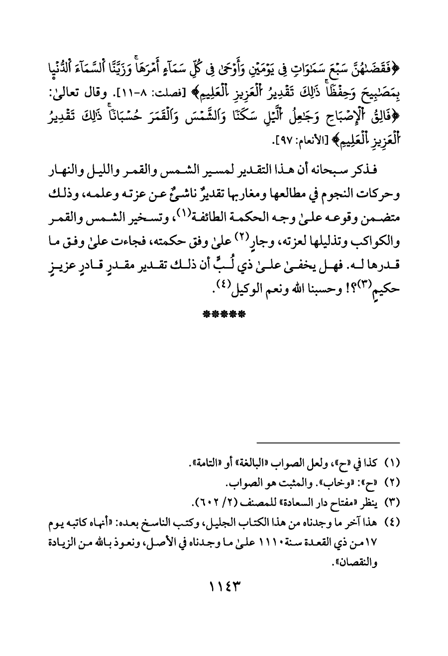 {فَقَضَاهُنَّ سَبْعَ سَمَاوَاتٍ فِي يَوْمَيْنِ وَأَوْحَى فِي كُلِّ سَمَاءٍ أَمْرَهَا وَزَيَّنَّا اَلسَّمَاءَ اَلدُّنْيا بِمَصَابِيحَ وَحِفْظًا ذَلِكَ تَقْدِيرُ اُلْعَزِيزِ اِلْعَلِيمِ} [فصلت: ٨ - ١١]. وقال تعالى: {فَالِقُ اُلْإِصْبَاحِ وَجَاعِلُ اُلَّيْلِ سَكَنًا وَاَلشَّمْسَ وَاَلْقَمَرَ حُسْبَانًا ذَلِكَ تَقْدِيرُ اُلْعَزِيزِ اِلْعَلِيمِ} [الأنعام: ٩٧].