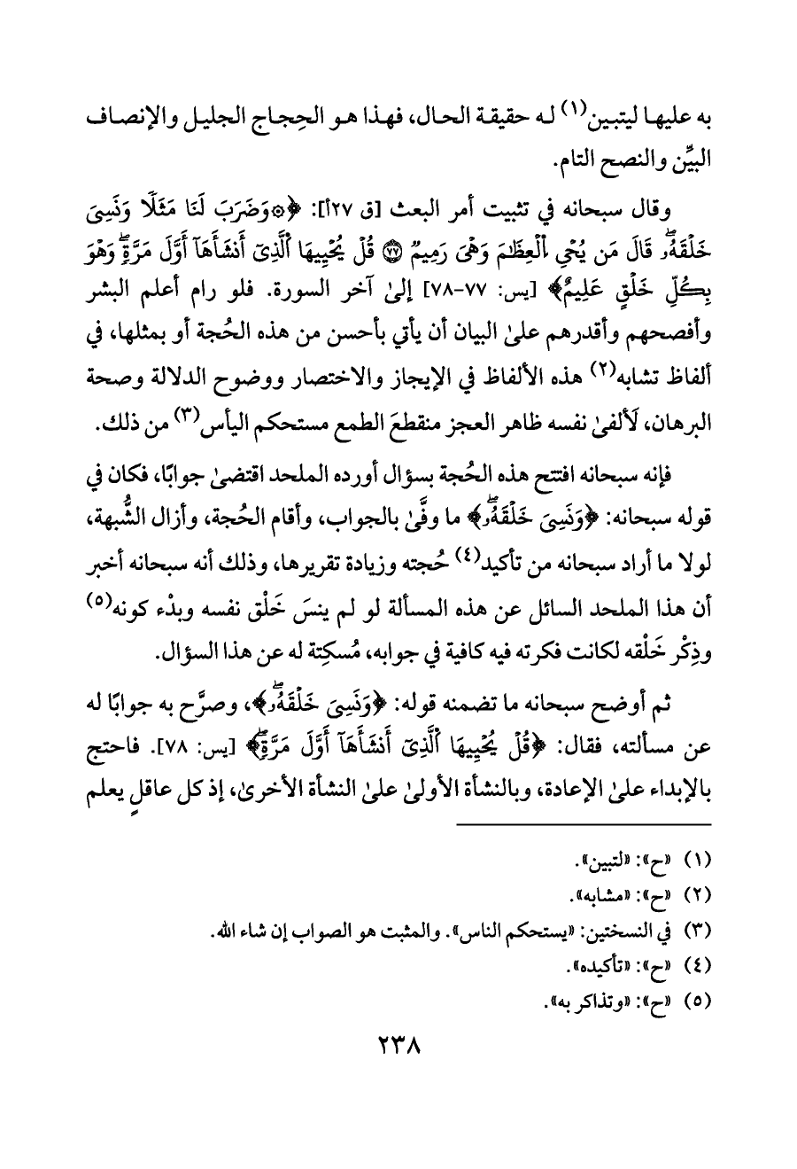وقال سبحانه في تثبيت أمر البعث [ق ٢٧ أ]: {* وَضَرَبَ لَنَا مَثَلًا وَنَسِيَ خَلْقَهُ قَالَ مَن يُحْيِ اِلْعِظَامَ وَهْيَ رَمِيمٌ (٧٧) قُلْ يُحْيِيهَا اَلَّذِي أَنشَأَهَا أَوَّلَ مَرَّةٍ وَهْوَ بِكُلِّ خَلْقٍ عَلِيمٌ} [يس: ٧٧ - ٧٨] إلى آخر السورة. فلو رام أعلم البشر وأفصحهم وأقدرهم على البيان أن يأتي بأحسن من هذه الحُجة أو بمثلها، في ألفاظ تشابه (¬٢) هذه الألفاظ في الإيجاز والاختصار ووضوح الدلالة وصحة البرهان، لَألفى نفسه ظاهر العجز منقطعَ الطمع مستحكم اليأس (¬٣) من ذلك.