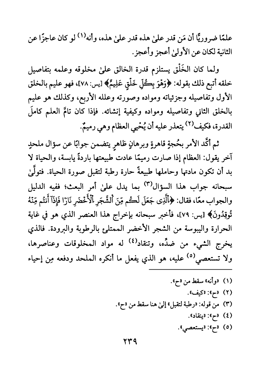 ثم أكَّد الأمر بحُجةٍ قاهرةٍ وبرهانٍ ظاهرٍ يتضمن جوابًا عن سؤال ملحدٍ آخر يقول: العظام إذا صارت رميمًا عادت طبيعتها باردةً يابسة، والحياة لا بد أن تكون مادتها وحاملها طبيعةً حارة رطبة لتقبل صورة الحياة. فتولَّى سبحانه جواب هذا السؤال (¬٣) بما يدل على أمر البعث؛ ففيه الدليل والجواب معًا، فقال: {اِلَّذِي جَعَلَ لَكُم مِّنَ اَلشَّجَرِ اِلْأَخْضَرِ نَارًا فَإِذَا أَنتُم مِّنْهُ تُوقِدُونَ} [يس: ٧٩]، فأخبر سبحانه بإخراج هذا العنصر الذي هو في غاية الحرارة واليبوسة من الشجر الأخضر الممتلئ بالرطوبة والبرودة. فالذي يخرج الشيء من ضدِّه، وتنقاد (¬٤) له مواد المخلوقات وعناصرها، ولا تستعصي (¬٥) عليه، هو الذي يفعل ما أنكره الملحد ودفعه مِن إحياء