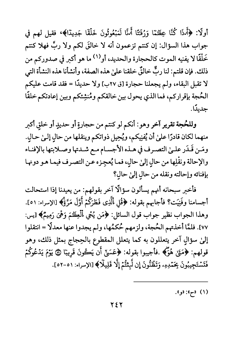 وللحُجة تقرير آخر وهو: أنكم لو كنتم من حجارةٍ أو حديدٍ أو خلقٍ أكبر منهما لكان قادرًا على أن يُفنِيكم، ويُحِيل ذواتكم وينقلها من حالٍ إلى حالٍ. ومَن قَدَر على التصرف في هذه الأجسام مع شدتها وصلابتها بالإفناء والإحالة ونقْلِها من حالٍ إلى حالٍ، فما يُعجِزه عن التصرف فيما هو دونها بإفنائه وإحالته ونقله من حالٍ إلى حالٍ؟
