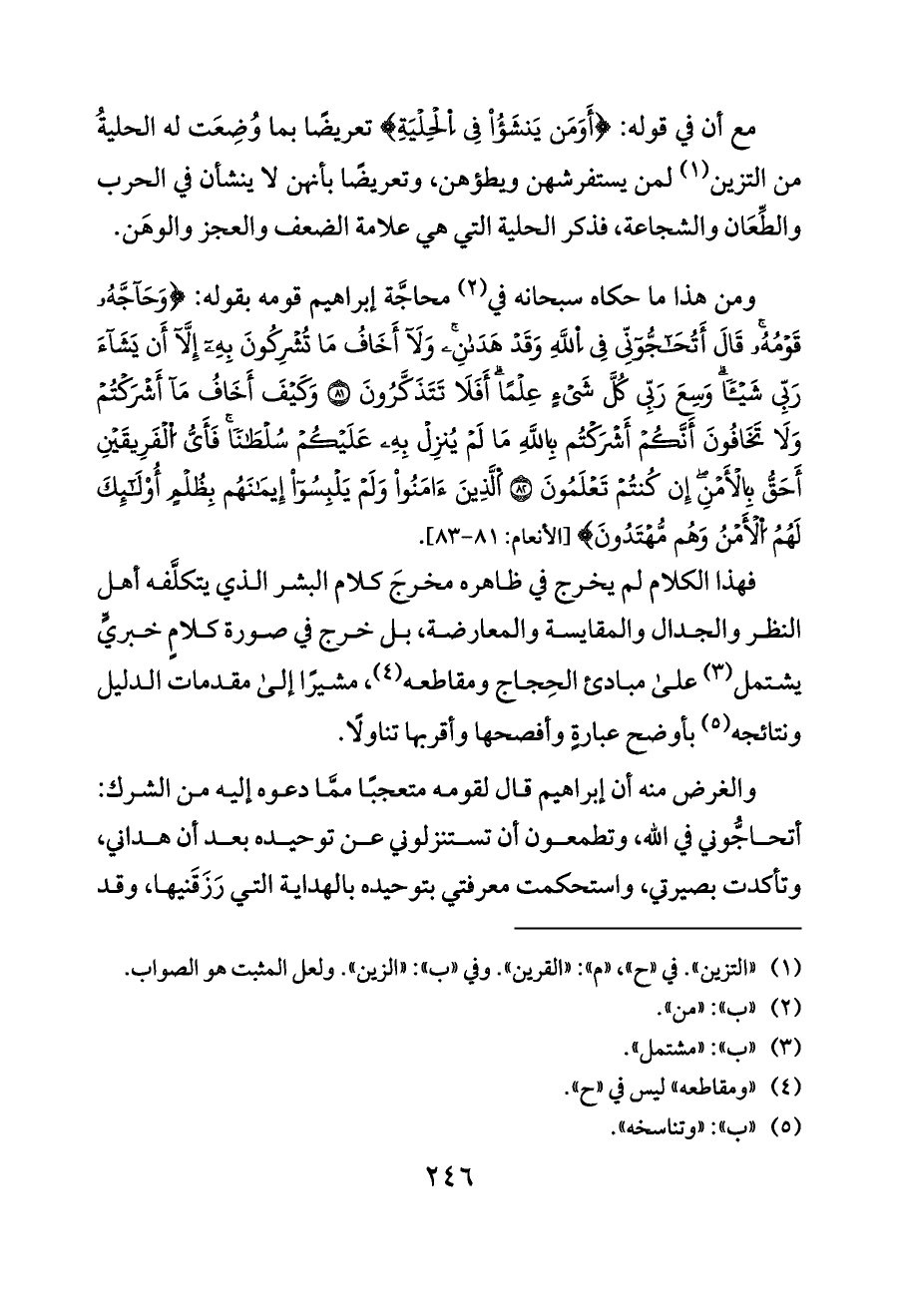 ومن هذا ما حكاه سبحانه في (¬٢) محاجَّة إبراهيم قومه بقوله: {وَحَاجَّهُ قَوْمُهُ قَالَ أَتُحَاجُّونِّي فِي اِللَّهِ وَقَدْ هَدَانِ وَلَا أَخَافُ مَا تُشْرِكُونَ بِهِ إِلَّا أَن يَشَاءَ رَبِّي شَيْئًا وَسِعَ رَبِّي كُلَّ شَيْءٍ عِلْمًا أَفَلَا تَتَذَكَّرُونَ (٨١ ) وَكَيْفَ أَخَافُ مَا أَشْرَكْتُمْ وَلَا تَخَافُونَ أَنَّكُمْ أَشْرَكْتُم بِاللَّهِ مَا لَمْ يُنزِلْ بِهِ عَلَيْكُمْ سُلْطَانًا فَأَيُّ اُلْفَرِيقَيْنِ أَحَقُّ بِالْأَمْنِ إِن كُنتُمْ تَعْلَمُونَ (٨٢ ) اَلَّذِينَ آمَنُوا وَلَمْ يَلْبِسُوا إِيمَانَهُم بِظُلْمٍ أُوْلَئِكَ لَهُمُ اُلْأَمْنُ وَهُم مُّهْتَدُونَ} [الأنعام: ٨١ - ٨٣].