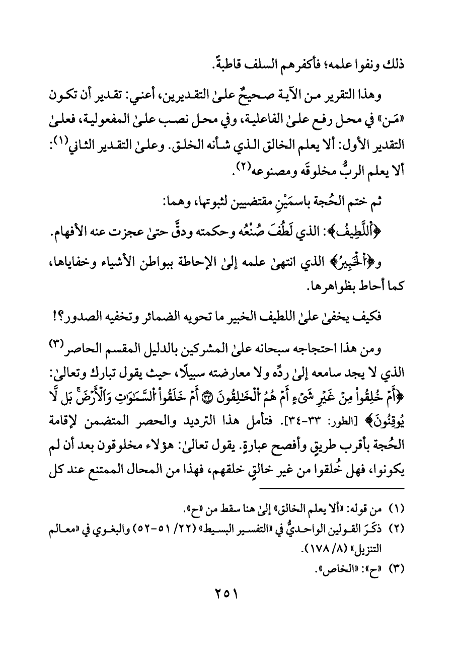 وهذا التقرير من الآية صحيحٌ على التقديرين، أعني: تقدير أن تكون «مَن» في محل رفع على الفاعلية، وفي محل نصب على المفعولية، فعلى التقدير الأول: ألا يعلم الخالق الذي شأنه الخلق. وعلى التقدير الثاني (¬١): ألا يعلم الربُّ مخلوقَه ومصنوعه (¬٢).
