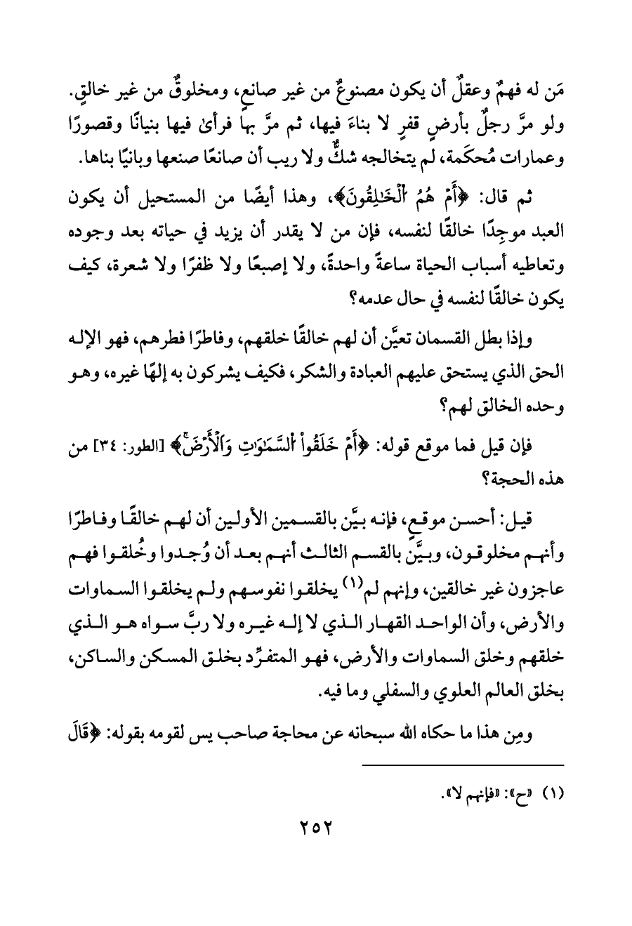 ثم قال: {أَمْ هُمُ اُلْخَالِقُونَ}، وهذا أيضًا من المستحيل أن يكون العبد موجِدًا خالقًا لنفسه، فإن من لا يقدر أن يزيد في حياته بعد وجوده وتعاطيه أسباب الحياة ساعةً واحدةً، ولا إصبعًا ولا ظفرًا ولا شعرة، كيف يكون خالقًا لنفسه في حال عدمه؟