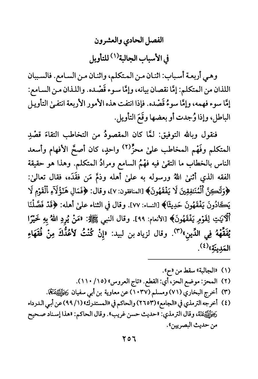 وهي أربعة أسباب: اثنان من المتكلم، واثنان من السامع. فالسببان اللذان من المتكلم: إمَّا نقصان بيانه، وإمَّا سوء قَصْده. واللذان من السامع: إمَّا سوء فهمه، وإمَّا سوءُ قَصْده. فإذا انتفت هذه الأمور الأربعة انتفى التأويل الباطل، وإذا وُجدت أو بعضها وقَعَ التأويل.