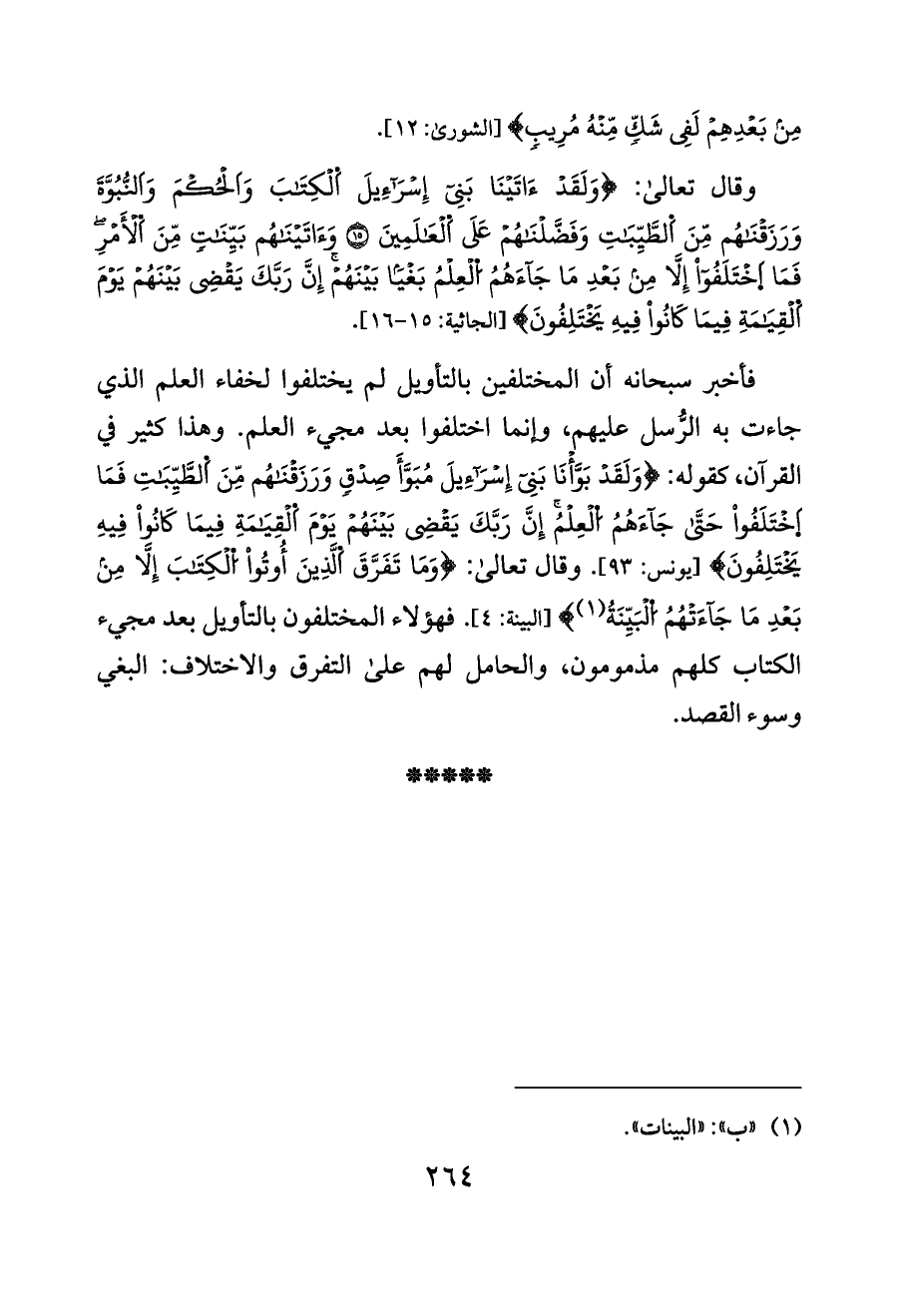 فأخبر سبحانه أن المختلفين بالتأويل لم يختلفوا لخفاء العلم الذي جاءت به الرُّسل عليهم، وإنما اختلفوا بعد مجيء العلم. وهذا كثير في القرآن، كقوله: {وَلَقَدْ بَوَّأْنَا بَنِي إِسْرَاءِيلَ مُبَوَّأَ صِدْقٍ وَرَزَقْنَاهُم مِّنَ اَلطَّيِّبَاتِ فَمَا اَخْتَلَفُوا حَتَّى جَاءَهُمُ اُلْعِلْمُ إِنَّ رَبَّكَ يَقْضِي بَيْنَهُمْ يَوْمَ اَلْقِيَامَةِ فِيمَا كَانُوا فِيهِ يَخْتَلِفُونَ} [يونس: ٩٣]. وقال تعالى: {وَمَا تَفَرَّقَ اَلَّذِينَ أُوتُوا اُلْكِتَابَ إِلَّا مِن بَعْدِ مَا جَاءَتْهُمُ اُلْبَيِّنَةُ (¬١)} [البينة: ٤]. فهؤلاء المختلفون بالتأويل بعد مجيء الكتاب كلهم مذمومون، والحامل لهم على التفرق والاختلاف: البغي وسوء القصد.