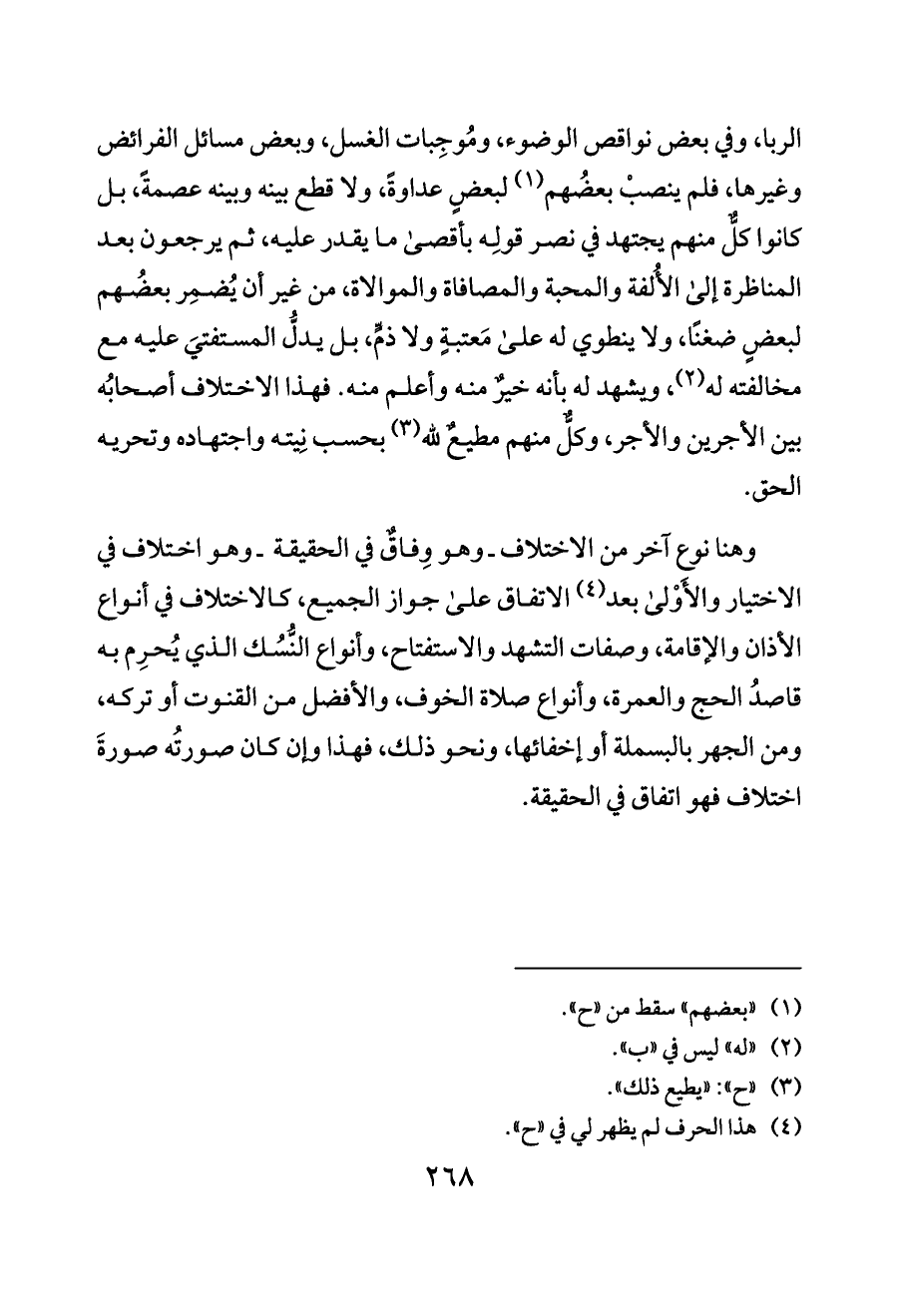 الربا، وفي بعض نواقص الوضوء، ومُوجِبات الغسل، وبعض مسائل الفرائض وغيرها، فلم ينصبْ بعضُهم (¬١) لبعضٍ عداوةً، ولا قطع بينه وبينه عصمةً، بل كانوا كلٌّ منهم يجتهد في نصر قولِه بأقصى ما يقدر عليه، ثم يرجعون بعد المناظرة إلى الأُلفة والمحبة والمصافاة والموالاة، من غير أن يُضمِر بعضُهم لبعضٍ ضغنًا، ولا ينطوي له على مَعتبةٍ ولا ذمٍّ، بل يدلُّ المستفتيَ عليه مع مخالفته له (¬٢)، ويشهد له بأنه خيرٌ منه وأعلم منه. فهذا الاختلاف أصحابُه بين الأجرين والأجر، وكلٌّ منهم مطيعٌ لله (¬٣) بحسب نِيته واجتهاده وتحريه الحق.