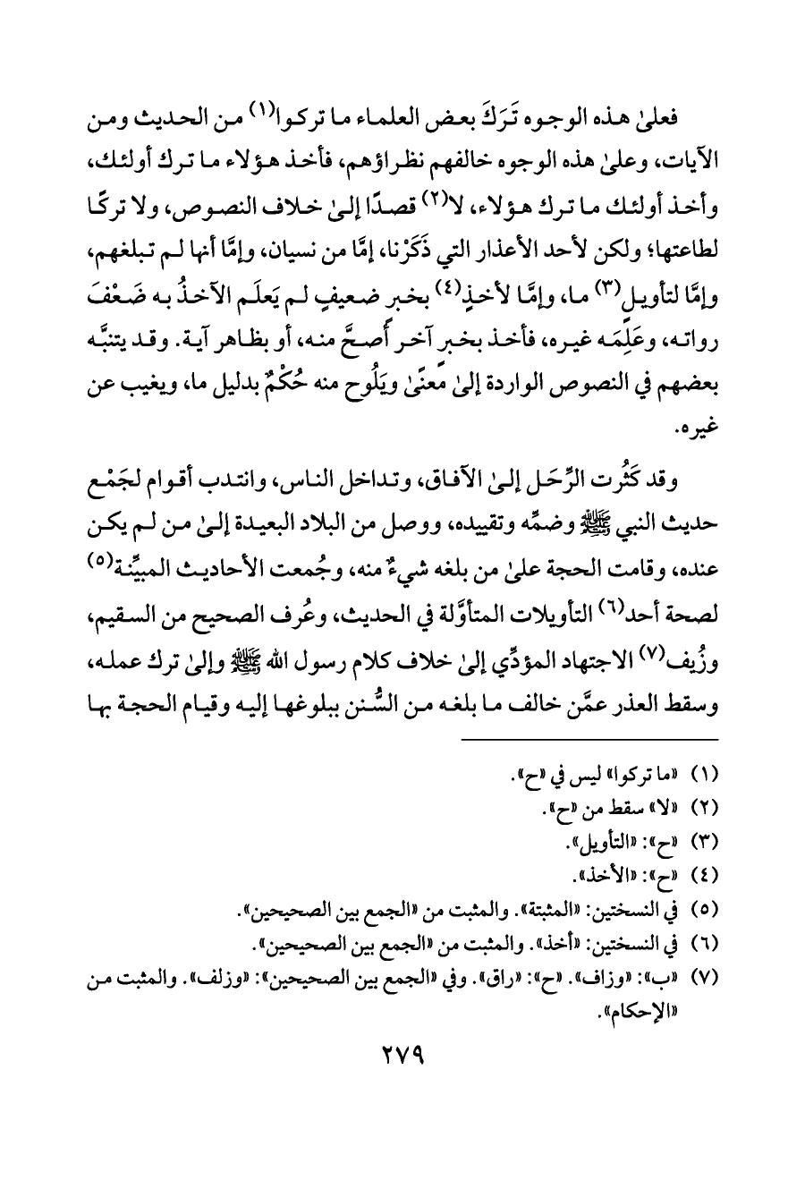 فعلى هذه الوجوه تَرَكَ بعض العلماء ما تركوا (¬١) من الحديث ومن الآيات، وعلى هذه الوجوه خالفهم نظراؤهم، فأخذ هؤلاء ما ترك أولئك، وأخذ أولئك ما ترك هؤلاء، لا (¬٢) قصدًا إلى خلاف النصوص، ولا تركًا لطاعتها؛ ولكن لأحد الأعذار التي ذَكَرْنا، إمَّا من نسيان، وإمَّا أنها لم تبلغهم، وإمَّا لتأويلٍ (¬٣) ما، وإمَّا لأخذٍ (¬٤) بخبرٍ ضعيفٍ لم يَعلَم الآخذُ به ضَعْفَ رواته، وعَلِمَه غيره، فأخذ بخبرٍ آخر أصحَّ منه، أو بظاهر آية. وقد يتنبَّه بعضهم في النصوص الواردة إلى معنًى ويَلُوح منه حُكْمٌ بدليل ما، ويغيب عن غيره.