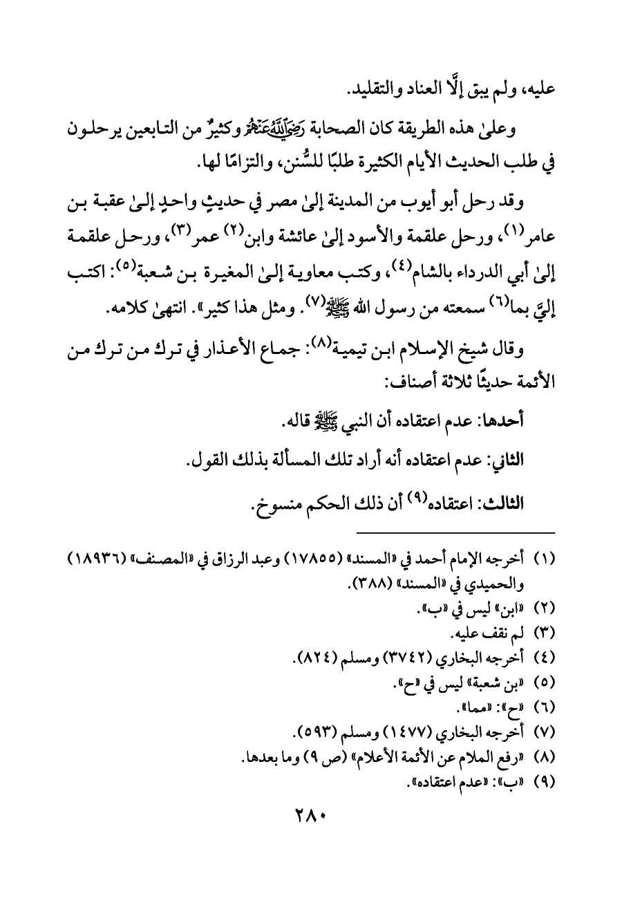 وقد رحل أبو أيوب من المدينة إلى مصر في حديثٍ واحدٍ إلى عقبة بن عامر (¬١)، ورحل علقمة والأسود إلى عائشة وابن (¬٢) عمر (¬٣)، ورحل علقمة إلى أبي الدرداء بالشام (¬٤)، وكتب معاوية إلى المغيرة بن شعبة (¬٥): اكتب إليَّ بما (¬٦) سمعته من رسول الله - صلى الله عليه وسلم - (¬٧). ومثل هذا كثير». انتهى كلامه.