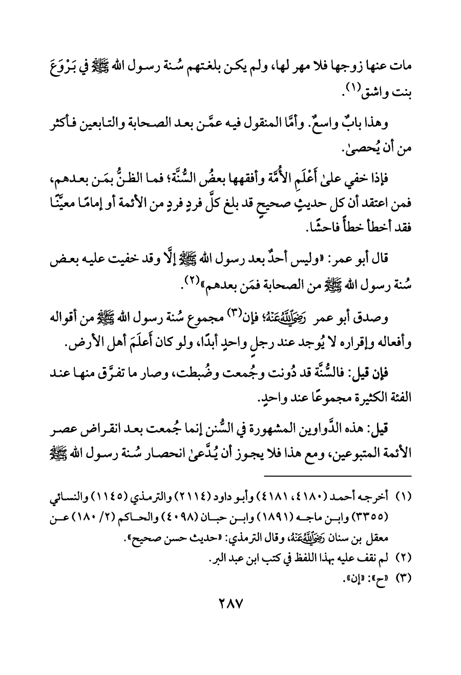 قال أبو عمر: «وليس أحدٌ بعد رسول الله - صلى الله عليه وسلم - إلَّا وقد خفيت عليه بعض سُنة رسول الله - صلى الله عليه وسلم - من الصحابة فمَن بعدهم» (¬٢).