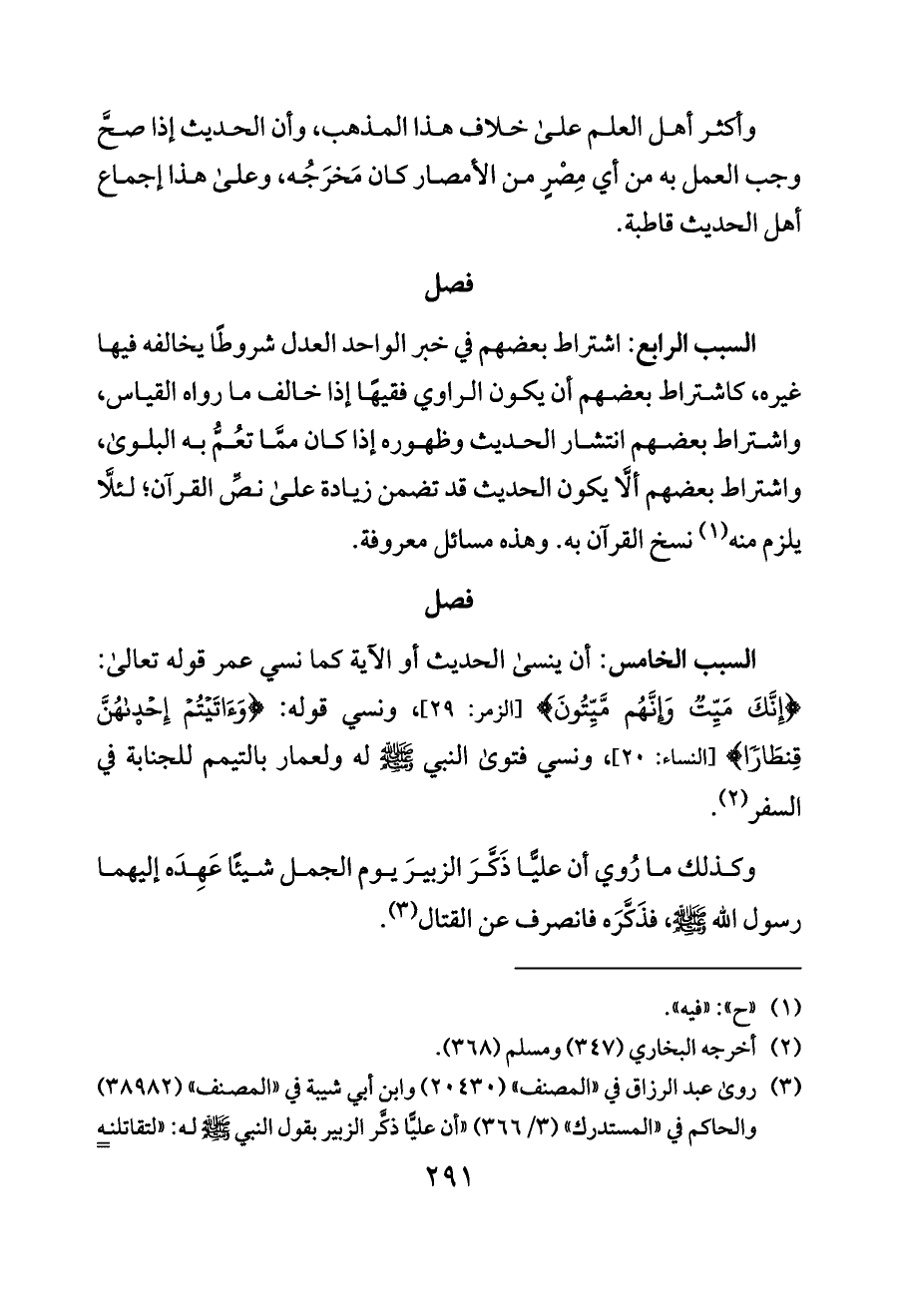 السبب الرابع: اشتراط بعضهم في خبر الواحد العدل شروطًا يخالفه فيها غيره، كاشتراط بعضهم أن يكون الراوي فقيهًا إذا خالف ما رواه القياس، واشتراط بعضهم انتشار الحديث وظهوره إذا كان ممَّا تعُمُّ به البلوى، واشتراط بعضهم ألَّا يكون الحديث قد تضمن زيادة على نصِّ القرآن؛ لئلَّا يلزم منه (¬١) نسخ القرآن به. وهذه مسائل معروفة.