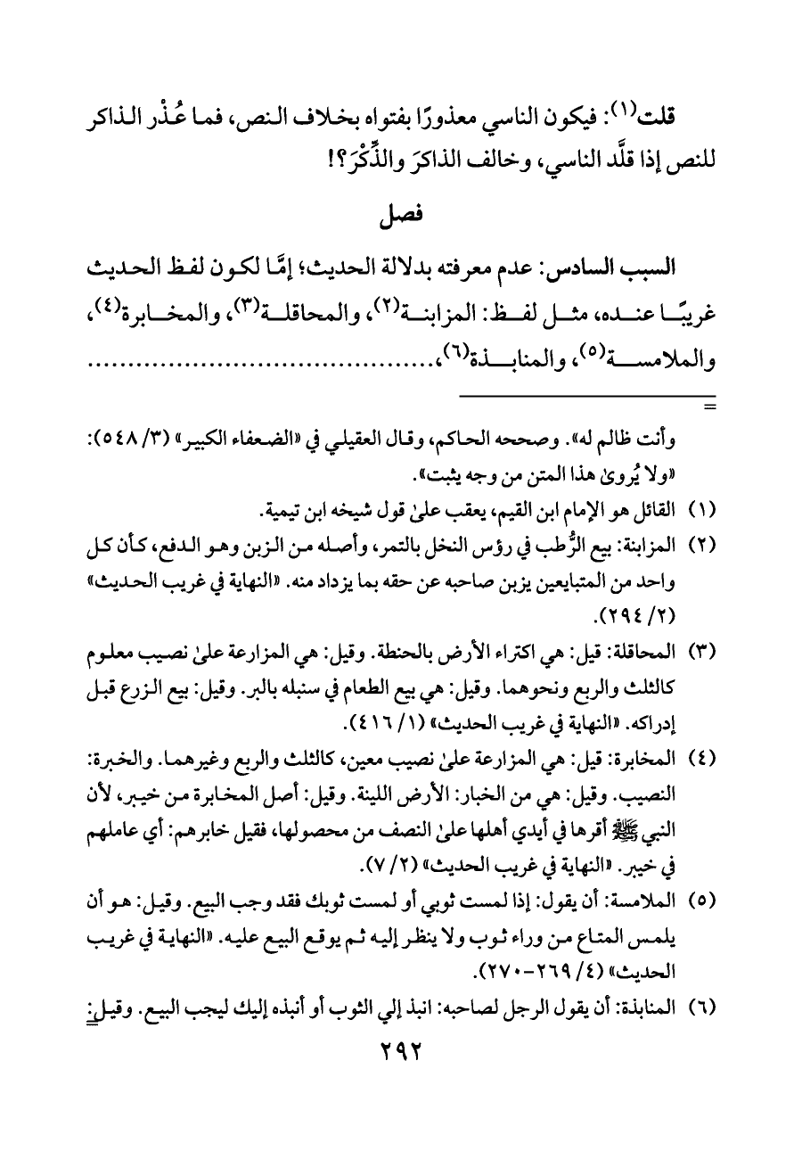 السبب السادس: عدم معرفته بدلالة الحديث؛ إمَّا لكون لفظ الحديث غريبًا عنده، مثل لفظ: المزابنة (¬٢)، والمحاقلة (¬٣)، والمخابرة (¬٤)، والملامسة (¬٥)، والمنابذة (¬٦)، ...........................................