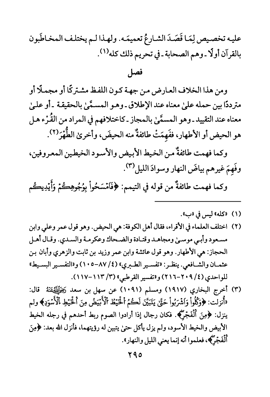 ومن هذا الخلاف العارض من جهة كون اللفظ مشتركًا أو مجملًا أو مترددًا بين حمله على معناه عند الإطلاق ـ وهو المسمَّى بالحقيقة ـ أو على معناه عند التقييد ـ وهو المسمَّى بالمجاز ـ كاختلافهم في المراد من القُرْء هل هو الحيض أو الأطهار، ففَهِمَتْ طائفةٌ منه الحيضَ، وأخرى الطُّهْرَ (¬٢).
