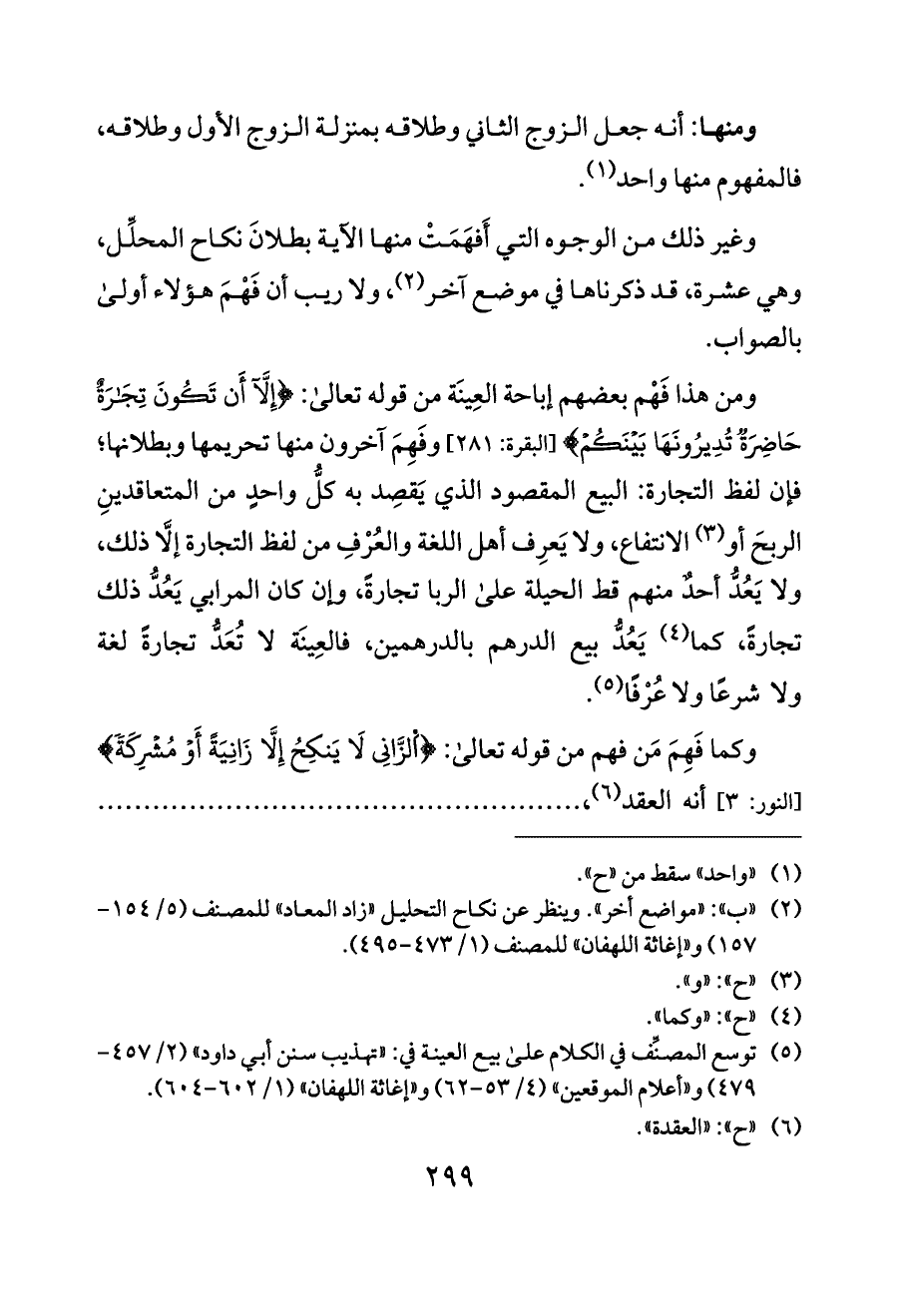 ومن هذا فَهْم بعضهم إباحة العِينَة من قوله تعالى: {إِلَّا أَن تَكُونَ تِجَارَةٌ حَاضِرَةٌ تُدِيرُونَهَا بَيْنَكُمْ} [البقرة: ٢٨١] وفَهِمَ آخرون منها تحريمها وبطلانها؛ فإن لفظ التجارة: البيع المقصود الذي يَقصِد به كلُّ واحدٍ من المتعاقدينِ الربحَ أو (¬٣) الانتفاع، ولا يَعرِف أهل اللغة والعُرْفِ من لفظ التجارة إلَّا ذلك، ولا يَعُدُّ أحدٌ منهم قط الحيلة على الربا تجارةً، وإن كان المرابي يَعُدُّ ذلك تجارةً، كما (¬٤) يَعُدُّ بيع الدرهم بالدرهمين، فالعِينَة لا تُعَدُّ تجارةً لغة ولا شرعًا ولا عُرْفًا (¬٥).