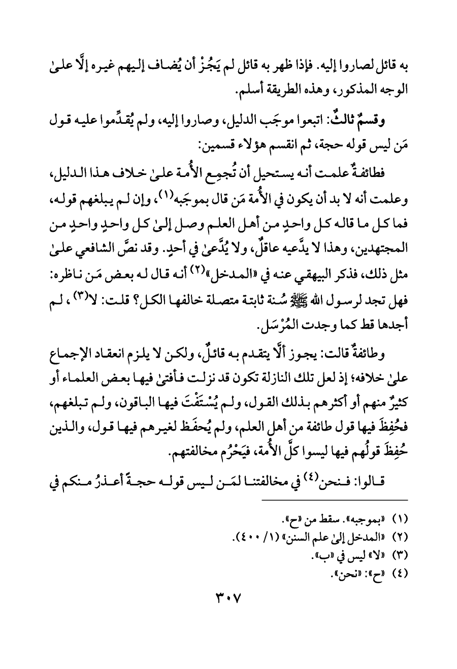 فطائفةٌ علمت أنه يستحيل أن تُجمِع الأُمة على خلاف هذا الدليل، وعلمت أنه لا بد أن يكون في الأُمة مَن قال بموجَبه (¬١)، وإن لم يبلغهم قوله، فما كل ما قاله كل واحدٍ من أهل العلم وصل إلى كل واحدٍ واحدٍ من المجتهدين، وهذا لا يدَّعيه عاقلٌ، ولا يُدَّعى في أحدٍ. وقد نصَّ الشافعي على مثل ذلك، فذكر البيهقي عنه في «المدخل» (¬٢) أنه قال له بعض مَن ناظره: فهل تجد لرسول الله - صلى الله عليه وسلم - سُنة ثابتة متصلة خالفها الكل؟ قلت: لا (¬٣)، لم أجدها قط كما وجدت المُرْسَل.