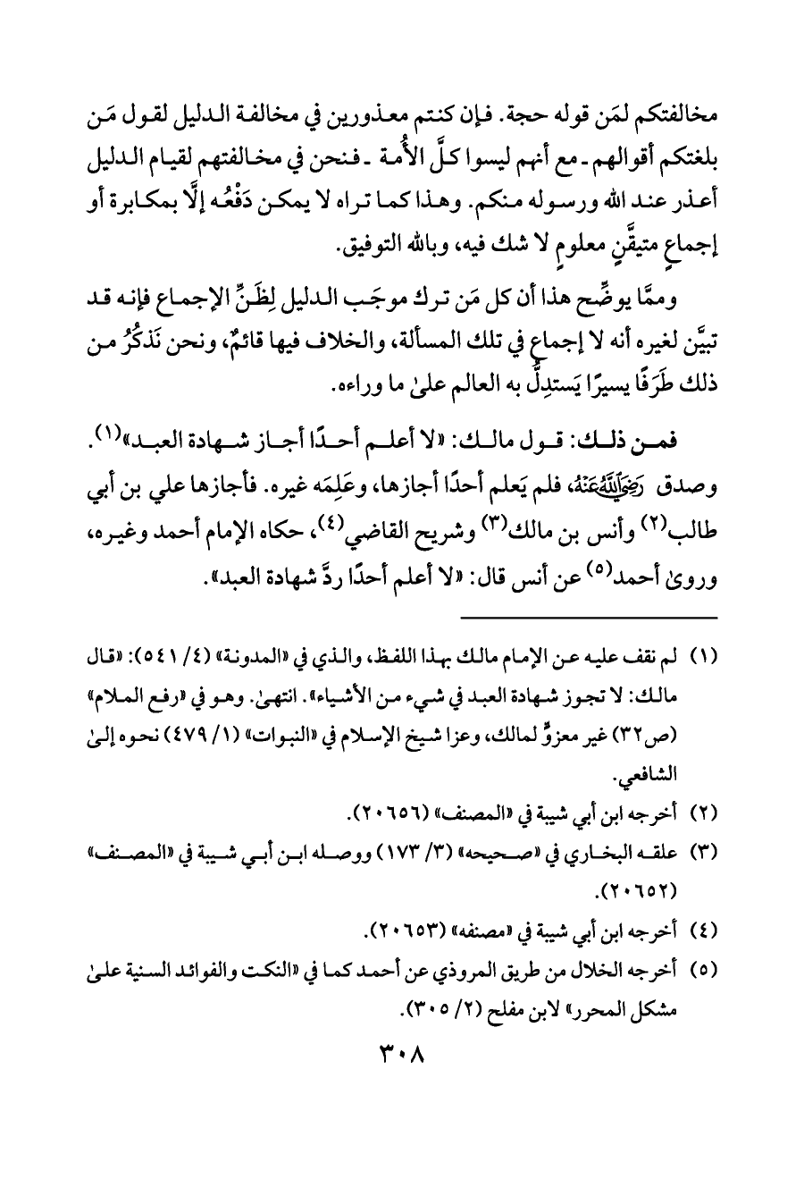 مخالفتكم لمَن قوله حجة. فإن كنتم معذورين في مخالفة الدليل لقول مَن بلغتكم أقوالهم ـ مع أنهم ليسوا كلَّ الأُمة ـ فنحن في مخالفتهم لقيام الدليل أعذر عند الله ورسوله منكم. وهذا كما تراه لا يمكن دَفْعُه إلَّا بمكابرة أو إجماعٍ متيقَّنٍ معلومٍ لا شك فيه، وبالله التوفيق.