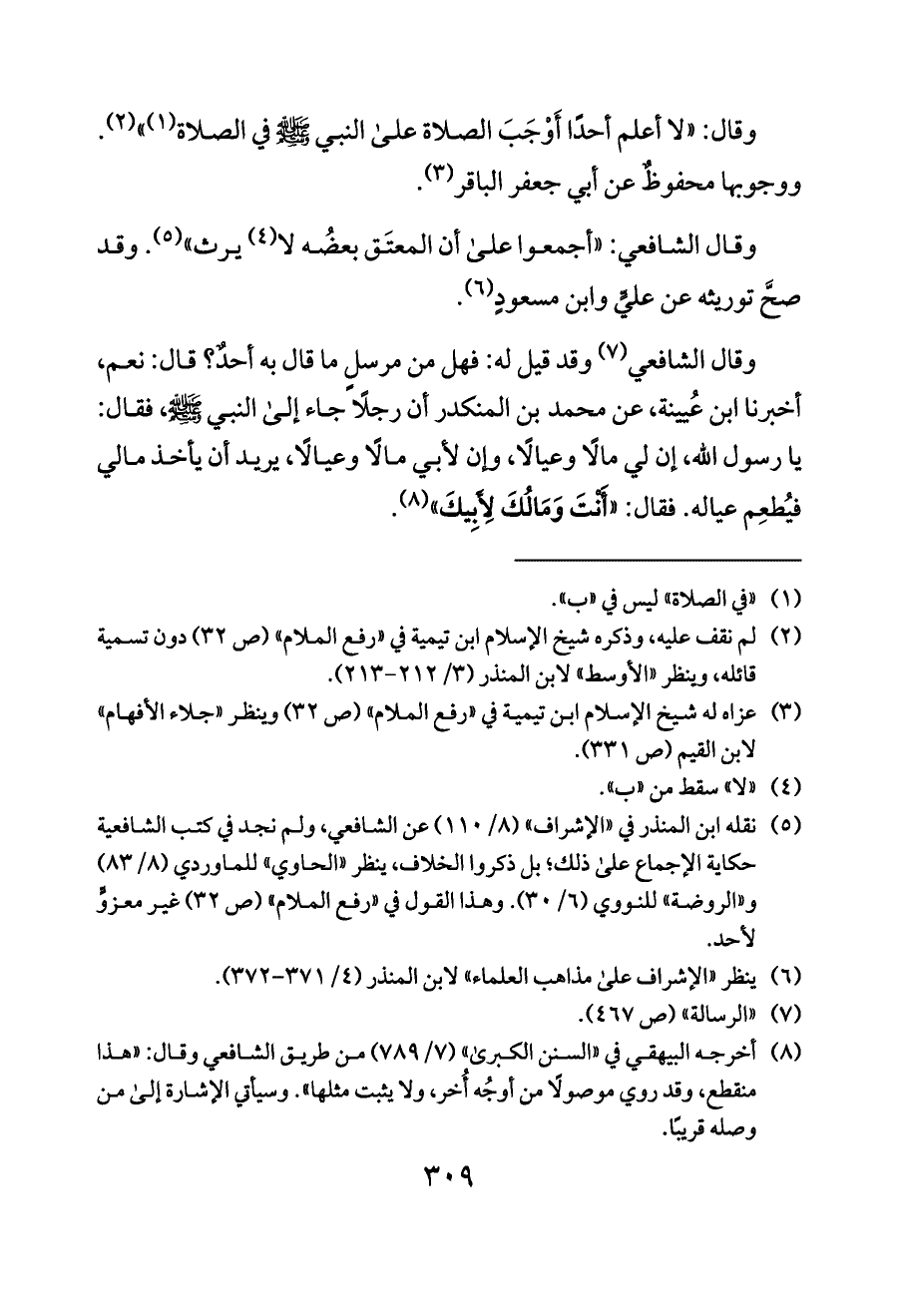 (¬٣) عزاه له شيخ الإسلام ابن تيمية في «رفع الملام» (ص ٣٢) وينظر «جلاء الأفهام» لابن القيم (ص ٣٣١).