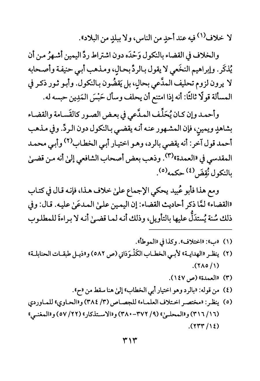 والخلاف في القضاء بالنكول وَحْدَه دون اشتراط ردِّ اليمين أشهرُ من أن يُذكَر. وإبراهيم النخَعي لا يقول بالردِّ بحالٍ، ومذهب أبي حنيفة وأصحابه لا يرون لزوم تحليف المدَّعي بحالٍ، بل يَقضُون بالنكول. وأبو ثور ذكر في المسألة قولًا ثالثًا: أنه إذا امتنع أن يحلف وسأل حَبْسَ المَدِين حبسه له.