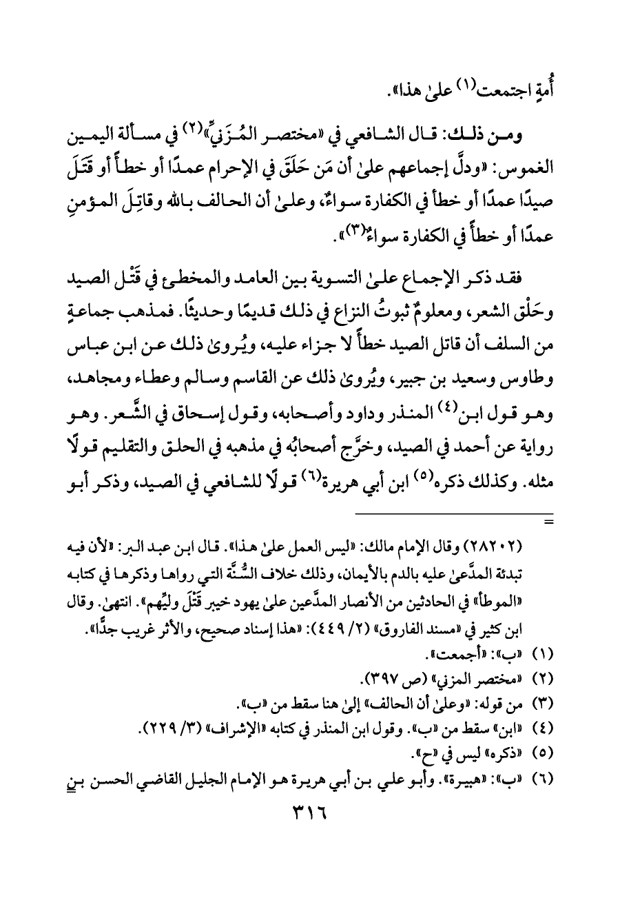 ومن ذلك: قال الشافعي في «مختصر المُزَنيِّ» (¬٢) في مسألة اليمين الغموس: «ودلَّ إجماعهم على أن مَن حَلَقَ في الإحرام عمدًا أو خطأً أو قَتَلَ صيدًا عمدًا أو خطأ في الكفارة سواءٌ، وعلى أن الحالف بالله وقاتِلَ المؤمنِ عمدًا أو خطأً في الكفارة سواءٌ (¬٣)».