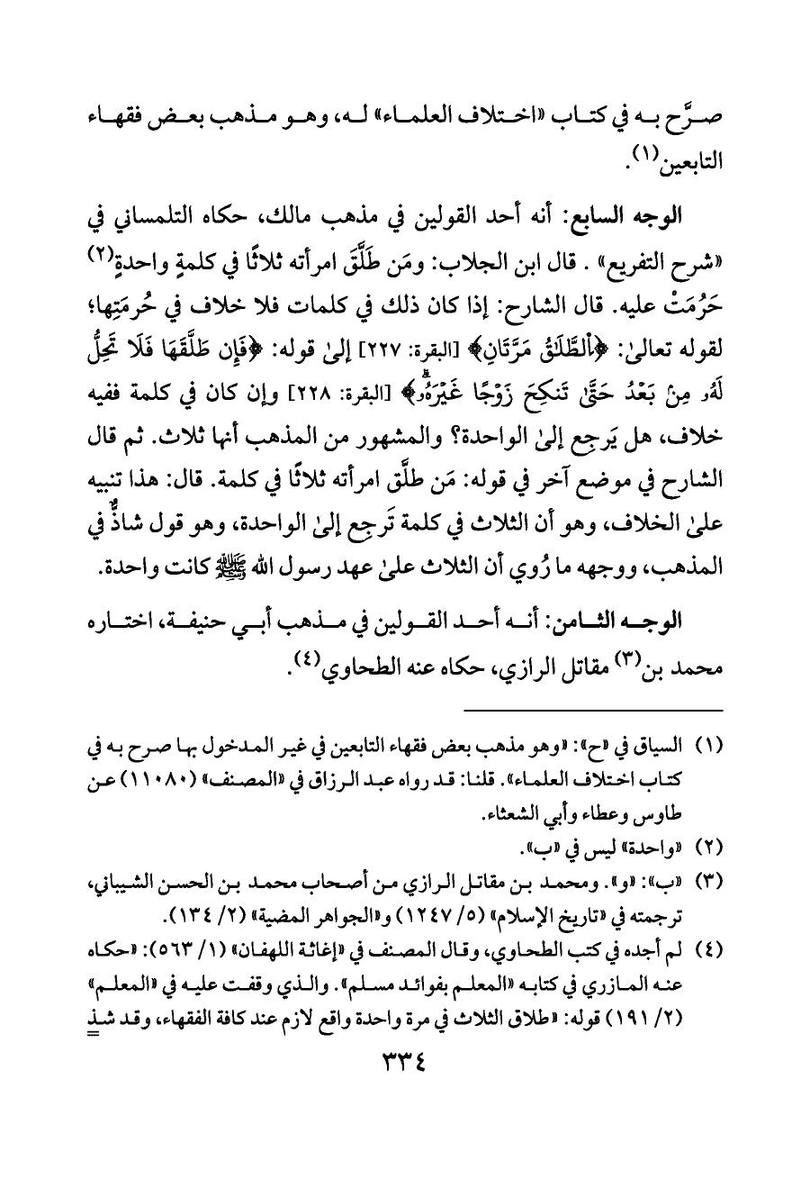 (¬٤) لم أجده في كتب الطحاوي، وقال المصنف في «إغاثة اللهفان» (١/ ٥٦٣): «حكاه عنه المازري في كتابه «المعلم بفوائد مسلم». والذي وقفت عليه في «المعلم» (٢/ ١٩١) قوله: «طلاق الثلاث في مرة واحدة واقع لازم عند كافة الفقهاء، وقد شذ الحجاج بن أرطاة وابن مقاتل فقالا: لا يقع». فلم يقيد ابن مقاتل، ووجدت في «المفهم» (٤/ ٢٣٧): «وهو مذهب مقاتل». فالله أعلم.