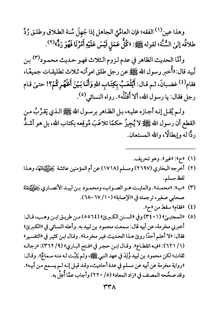 وأمَّا الحديث الظاهر في عدم لزوم الثلاث فهو حديث محمود (¬٣) بن لَبيد قال: «أُخبر رسول الله - صلى الله عليه وسلم - عن رجل طلق امرأته ثلاث تطليقات جميعًا، فقام (¬٤) غضبانَ، ثم قال: أَيُلْعَبُ بِكِتَابِ اللهِ وَأَنَا بَيْنَ أَظْهُرِكُمْ؟! حتى قام رجل فقال: يا رسول الله، ألا أَقتُلُه». رواه النسائي (¬٥).