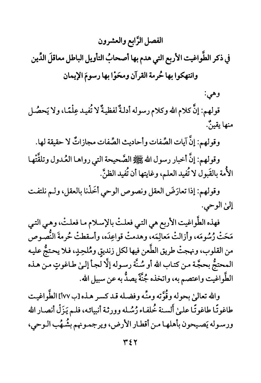 فهذه الطَّواغيت الأربع هي التي فعلتْ بالإسلام ما فعلتْ، وهي التي مَحَتْ رُسُومَه، وأزالتْ مَعالِمَه، وهدمتْ قواعِدَه، وأسقطتْ حُرمةَ النُّصوص من القلوب، ونهجتْ طريق الطَّعن فيها لكل زنديقٍ ومُلحِدٍ، فلا يحتجُّ عليه المحتجُّ بحجَّة من كتاب الله أو سُنَّة رسوله إلَّا لجأ إلى طاغوتٍ من هذه الطَّواغيت واعتصم به، واتخذه جُنَّةً يصدُّ به عن سبيل الله.