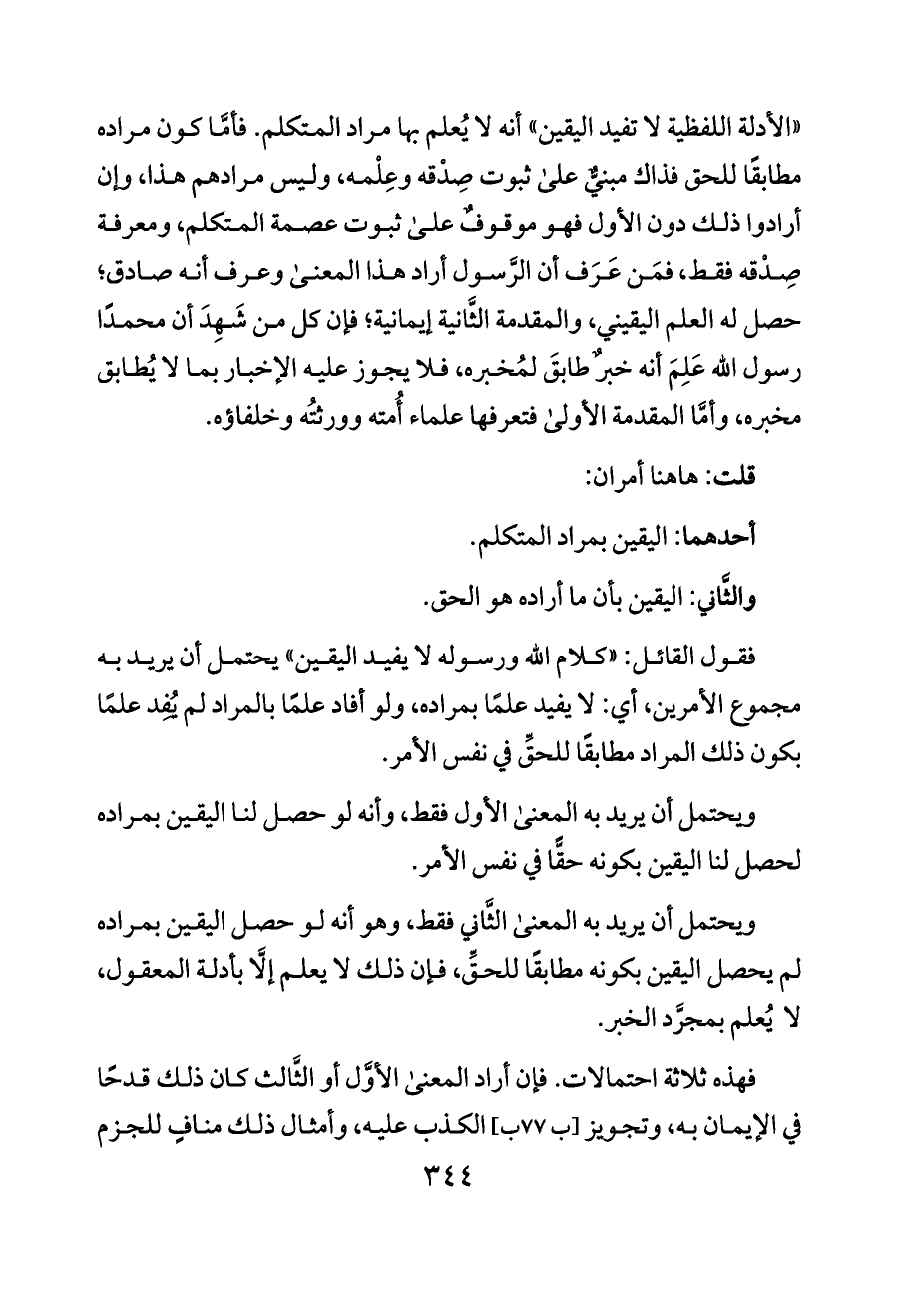 «الأدلة اللفظية لا تفيد اليقين» أنه لا يُعلم بها مراد المتكلم. فأمَّا كون مراده مطابقًا للحق فذاك مبنيٌّ على ثبوت صِدْقه وعِلْمه، وليس مرادهم هذا، وإن أرادوا ذلك دون الأول فهو موقوفٌ على ثبوت عصمة المتكلم، ومعرفة صِدْقه فقط، فمَن عَرَف أن الرَّسول أراد هذا المعنى وعرف أنه صادق؛ حصل له العلم اليقيني، والمقدمة الثَّانية إيمانية؛ فإن كل من شَهِدَ أن محمدًا رسول الله عَلِمَ أنه خبرٌ طابقَ لمُخبره، فلا يجوز عليه الإخبار بما لا يُطابق مخبره، وأمَّا المقدمة الأولى فتعرفها علماء أُمته وورثتُه وخلفاؤه.