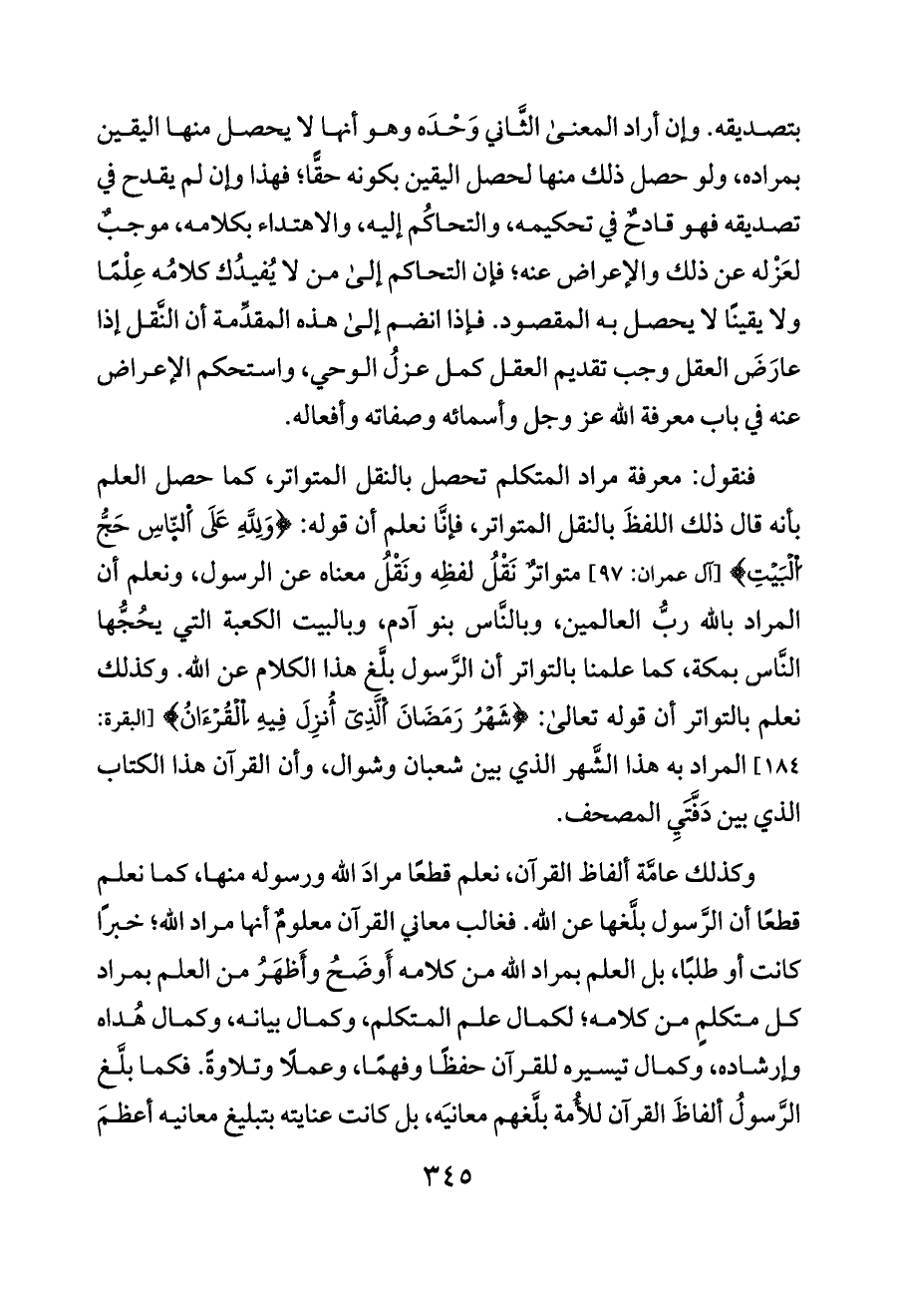 فنقول: معرفة مراد المتكلم تحصل بالنقل المتواتر، كما حصل العلم بأنه قال ذلك اللفظَ بالنقل المتواتر، فإنَّا نعلم أن قوله: {وَلِلَّهِ عَلَى اَلنَّاسِ حَجُّ اُلْبَيْتِ} [آل عمران: ٩٧] متواترٌ نَقْلُ لفظِه ونَقْلُ معناه عن الرسول، ونعلم أن المراد بالله ربُّ العالمين، وبالنَّاس بنو آدم، وبالبيت الكعبة التي يحُجُّها النَّاس بمكة، كما علمنا بالتواتر أن الرَّسول بلَّغ هذا الكلام عن الله. وكذلك نعلم بالتواتر أن قوله تعالى: {شَهْرُ رَمَضَانَ اَلَّذِي أُنزِلَ فِيهِ اِلْقُرْآنُ} [البقرة: ١٨٤] المراد به هذا الشَّهر الذي بين شعبان وشوال، وأن القرآن هذا الكتاب الذي بين دَفَّتَيِ المصحف.