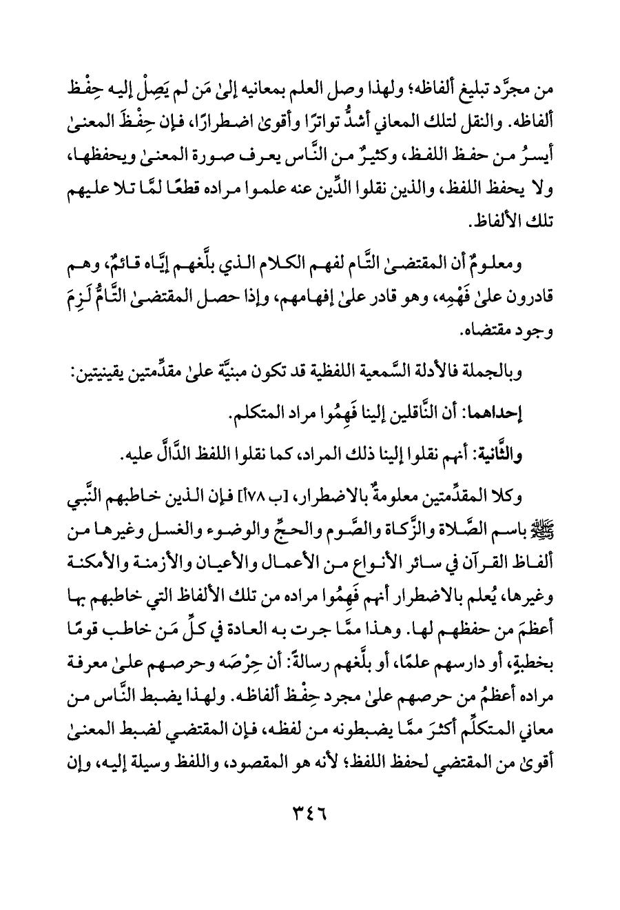وكلا المقدِّمتين معلومةٌ بالاضطرار، [ب ٧٨ أ] فإن الذين خاطبهم النَّبي - صلى الله عليه وسلم - باسم الصَّلاة والزَّكاة والصَّوم والحجِّ والوضوء والغسل وغيرها من ألفاظ القرآن في سائر الأنواع من الأعمال والأعيان والأزمنة والأمكنة وغيرها، يُعلم بالاضطرار أنهم فَهِمُوا مراده من تلك الألفاظ التي خاطبهم بها أعظمَ من حفظهم لها. وهذا ممَّا جرت به العادة في كلِّ مَن خاطب قومًا بخطبةٍ، أو دارسهم علمًا، أو بلَّغهم رسالةً: أن حِرْصَه وحرصهم على معرفة مراده أعظمُ من حرصهم على مجرد حِفْظ ألفاظه. ولهذا يضبط النَّاس من معاني المتكلِّم أكثرَ ممَّا يضبطونه من لفظه، فإن المقتضي لضبط المعنى أقوى من المقتضي لحفظ اللفظ؛ لأنه هو المقصود، واللفظ وسيلة إليه، وإن