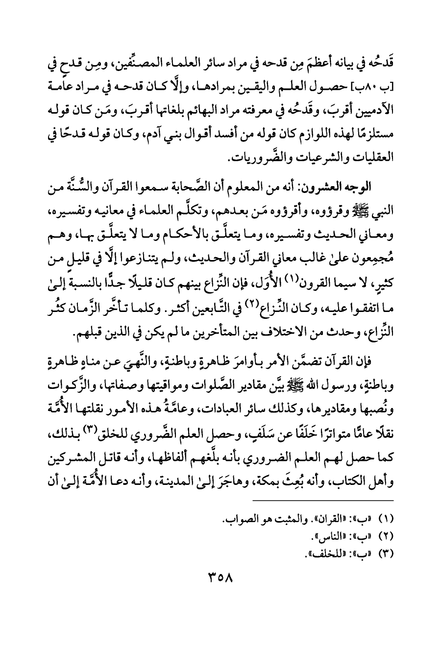 الوجه العشرون: أنه من المعلوم أن الصَّحابة سمعوا القرآن والسُّنَّة من النبي - صلى الله عليه وسلم - وقرؤوه، وأقرؤوه مَن بعدهم، وتكلَّم العلماء في معانيه وتفسيره، ومعاني الحديث وتفسيره، وما يتعلَّق بالأحكام وما لا يتعلَّق بها، وهم مُجمِعون على غالب معاني القرآن والحديث، ولم يتنازعوا إلَّا في قليلٍ من كثيرٍ، لا سيما القرون (¬١) الأُوَل، فإن النِّزاع بينهم كان قليلًا جدًّا بالنسبة إلى ما اتفقوا عليه، وكان النِّزاع (¬٢) في التَّابعين أكثر. وكلما تأخَّر الزَّمان كثُر النِّزاع، وحدث من الاختلاف بين المتأخرين ما لم يكن في الذين قبلهم.
